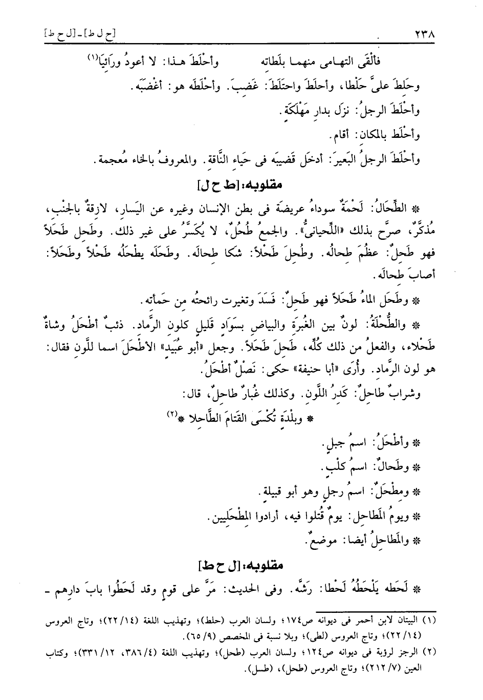 فألْقَى التهامي مِنْهُمَا بلَطاتِه ... وأحْلَطَ هَذَا: لَا أعودُ ورَائِيَا