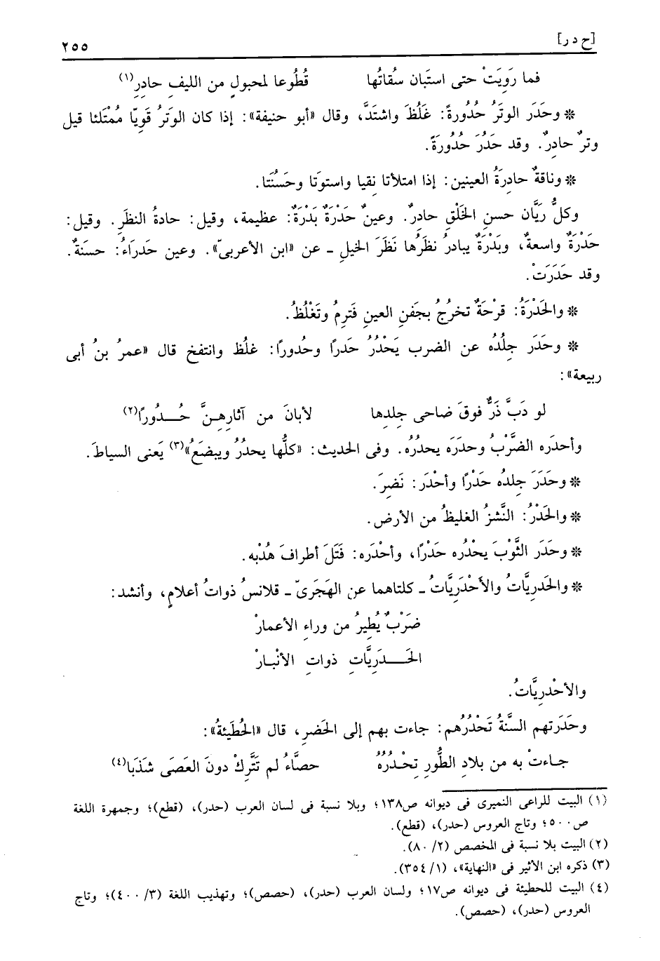 وحَدَر جلده عَن الضَّرْب يَحْدُرُ حَدراً وحُدوراً: غلظ وانتفخ، قَالَ عمر بن أبي ربيعَة: