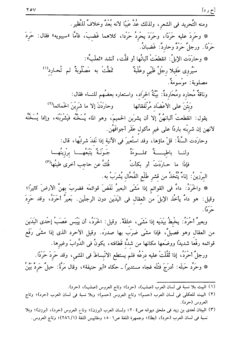 وحارَدَت الْإِبِل: انْقَطَعت أَلْبَانهَا أَو قلت. أنْشد ثَعْلَب: