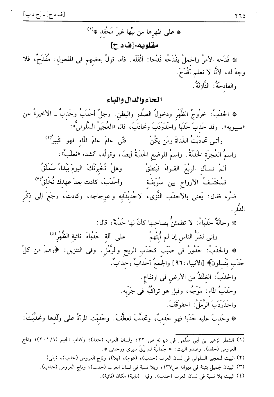 فسره فَقَالَ: يَعْنِي بالأحدَب النؤى، لاحدِيدابِه واعوجاجه، وكادت، رَجَعَ إِلَى ذكر الدَّار.