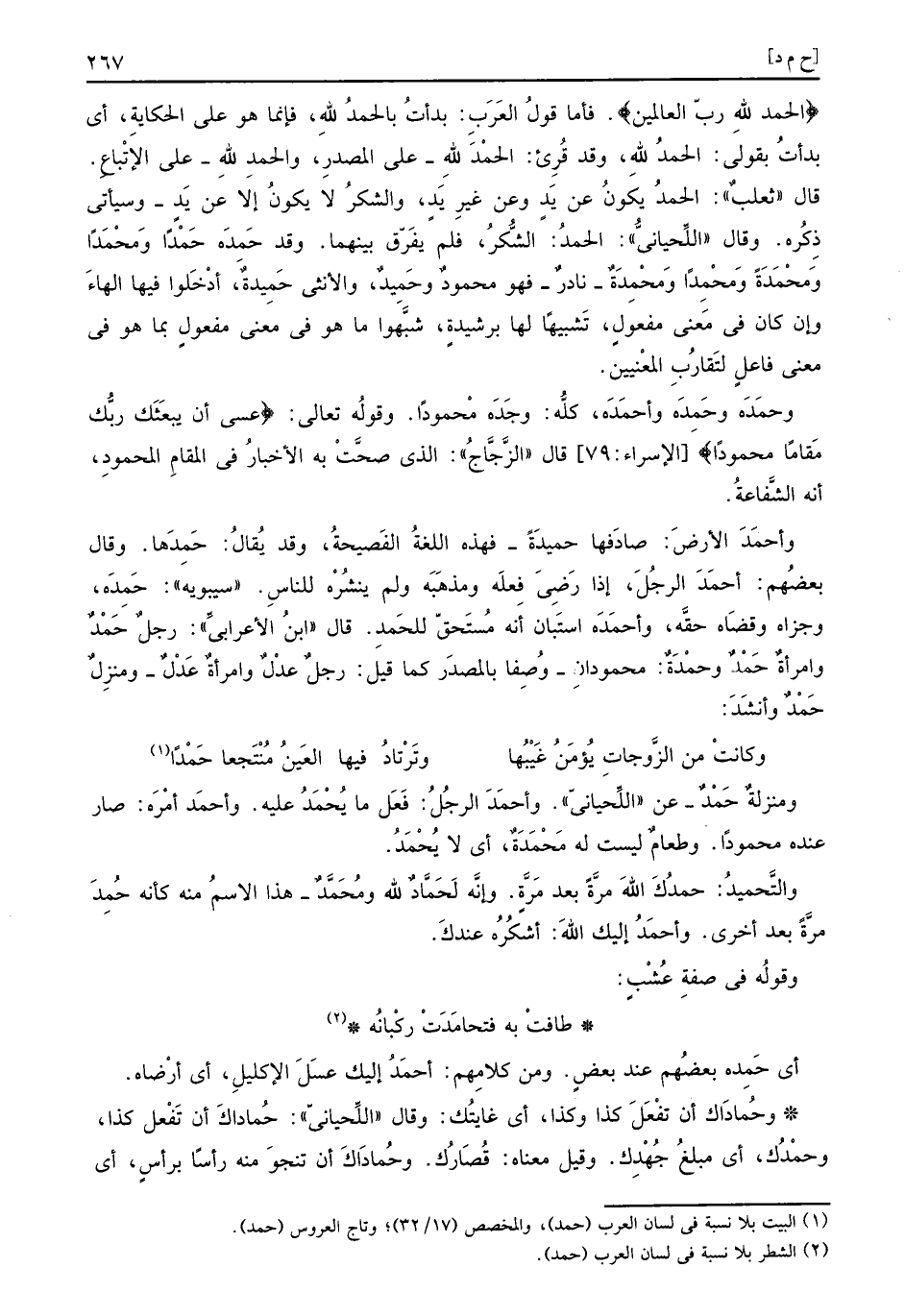 الْحَمد لله رب الْعَالمين) . فَأَما قَول الْعَرَب: بدأت بِالْحَمْد لله، فَنَامَ هُوَ على الْحِكَايَة، أَي بدأت بِقَوْلِي: الْحَمد لله، وَقد قريء: الْحَمد لله، على الْمصدر، وَالْحَمْد لله، على الإتباع قَالَ ثَعْلَب: الْحَمد يكون عَن يَد وَعَن غير يَد، وَالشُّكْر لَا يكون إِلَّا عَن يَد، وَسَيَأْتِي ذكره. وَقَالَ الَّلحيانيّ: الْحَمد: الشُّكْر، فَلم يفرق بَينهمَا. وَقد حَمِدَه حَمْداً ومحْمَداً ومحْمَدَةً ومَحْمِداً ومَحْمِدَةٌ، نَادِر، فَهُوَ محمودٌ وحَمِيدٌ، وَالْأُنْثَى حميدة، أدخلُوا فِيهَا الْهَاء وَإِن كَانَ فِي معنى مفعول، تَشْبِيها لَهَا برشيدة، شبهوا مَا هُوَ فِي معنى مفعول بِمَا هُوَ فِي معنى فَاعل لتقارب الْمَعْنيين.