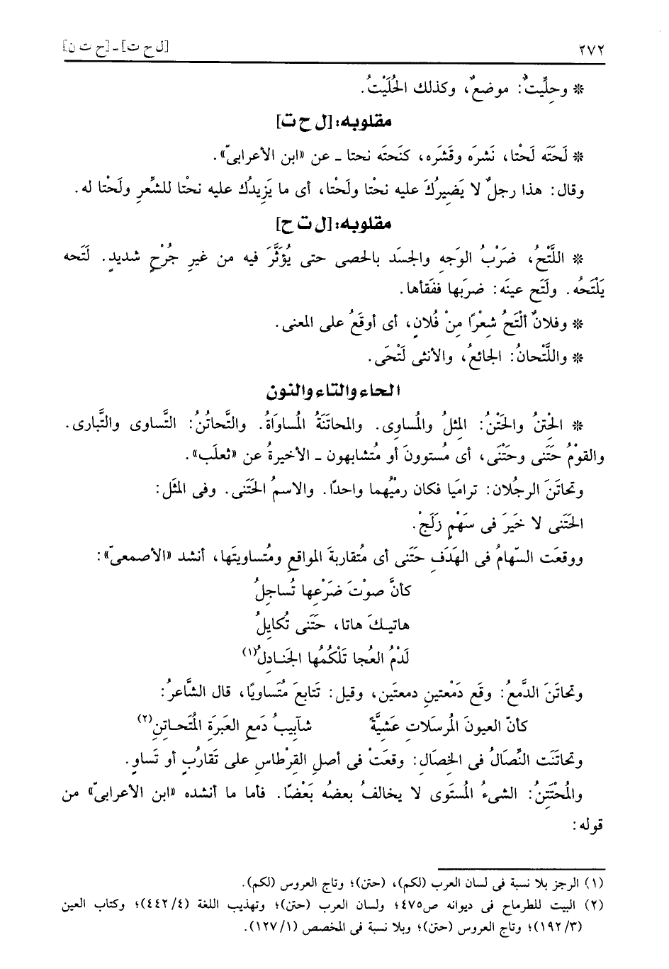الحِتْنُ والحَتْنُ: الْمثل والمساوي. والمحاتَنَةُ الْمُسَاوَاة. والتَّحاتُنُ: التَّسَاوِي والتباري. وَالْقَوْم حَتَنى وحَتْنَى، أَي مستوون أَو متشابهون، الْأَخِيرَة عَن ثَعْلَب.