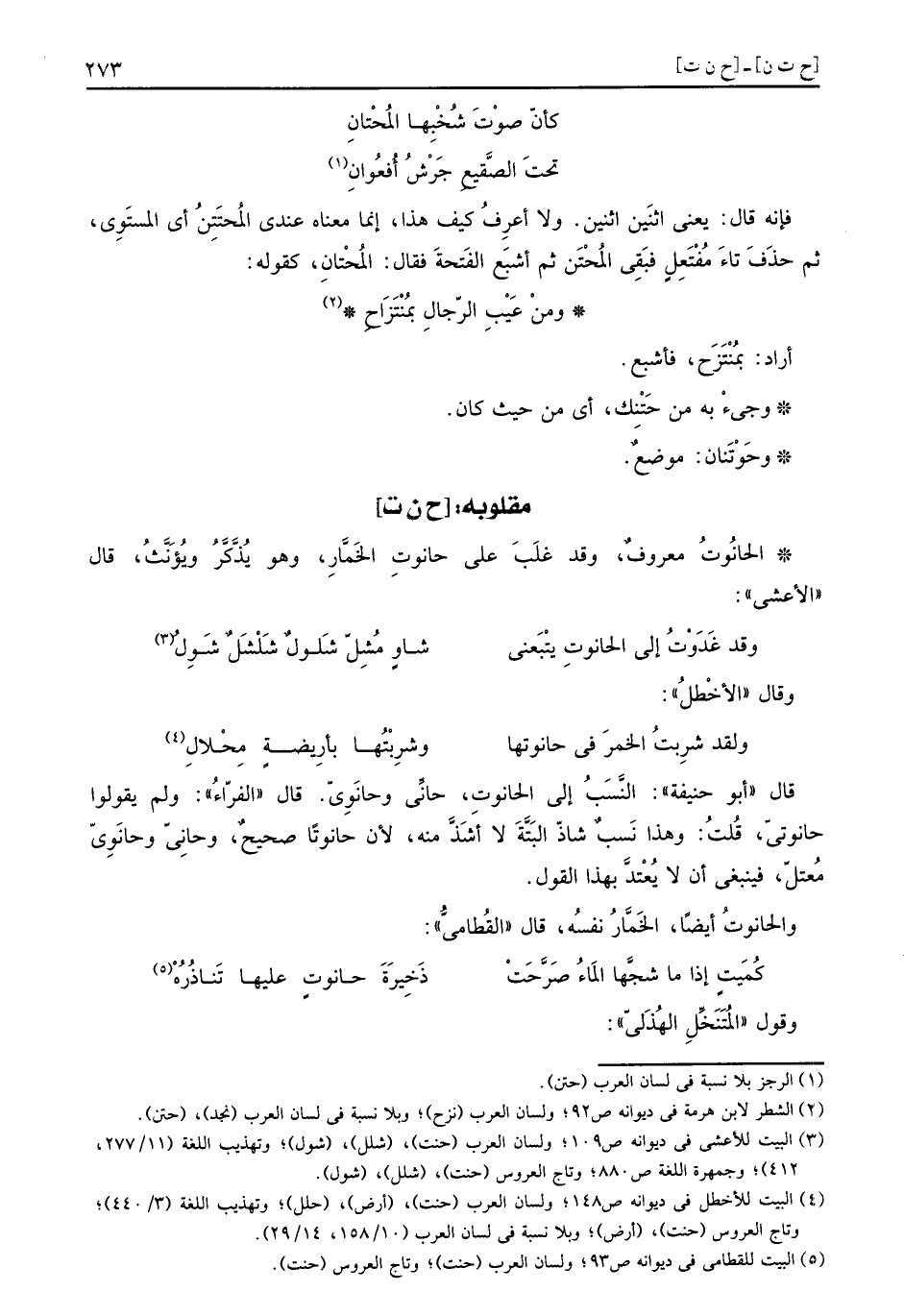 فَإِنَّهُ قَالَ: يَعْنِي اثْنَيْنِ اثْنَيْنِ. وَلَا أعرف كَيفَ هَذَا، إِنَّمَا مَعْنَاهُ عِنْدِي المُحتَتِنُ أَي المستوى، ثمَّ حذف مفتعل فَبَقيَ المُحْتَن ثمَّ أشْبع الفتحة فَقَالَ: المُحْتانِ، كَقَوْلِه:
