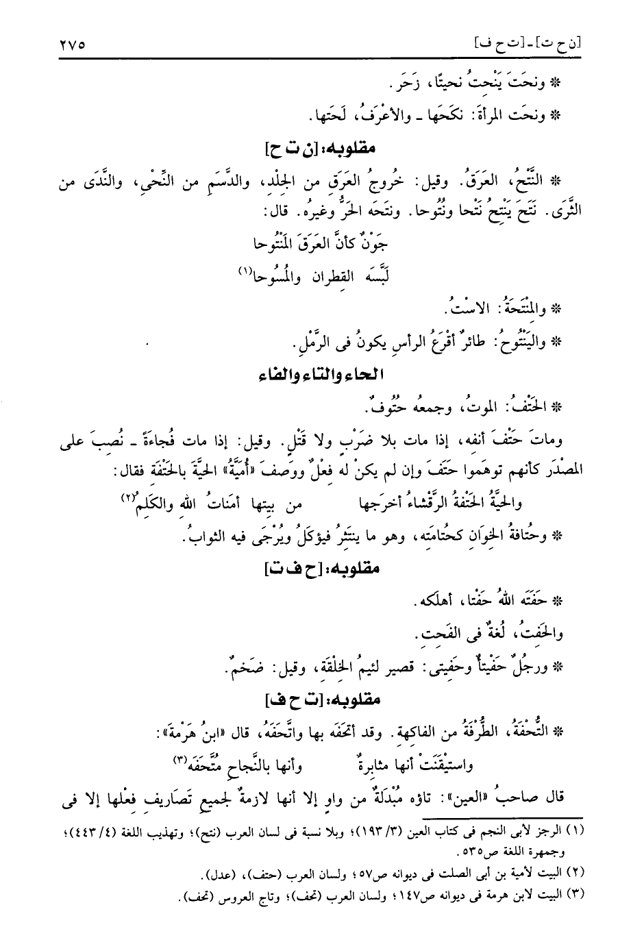 وَمَات حَتْفَ أَنفه، إِذا مَاتَ بِلَا ضرب وَلَا قتل. وَقيل: إِذا مَاتَ فَجْأَة، نصب على الْمصدر كَأَنَّهُمْ توهموا حَتَفَ وَإِن لم يكن لَهُ فعل. وَوصف أُميَّة الْحَيَّة بالحَتْفَةِ فَقَالَ: