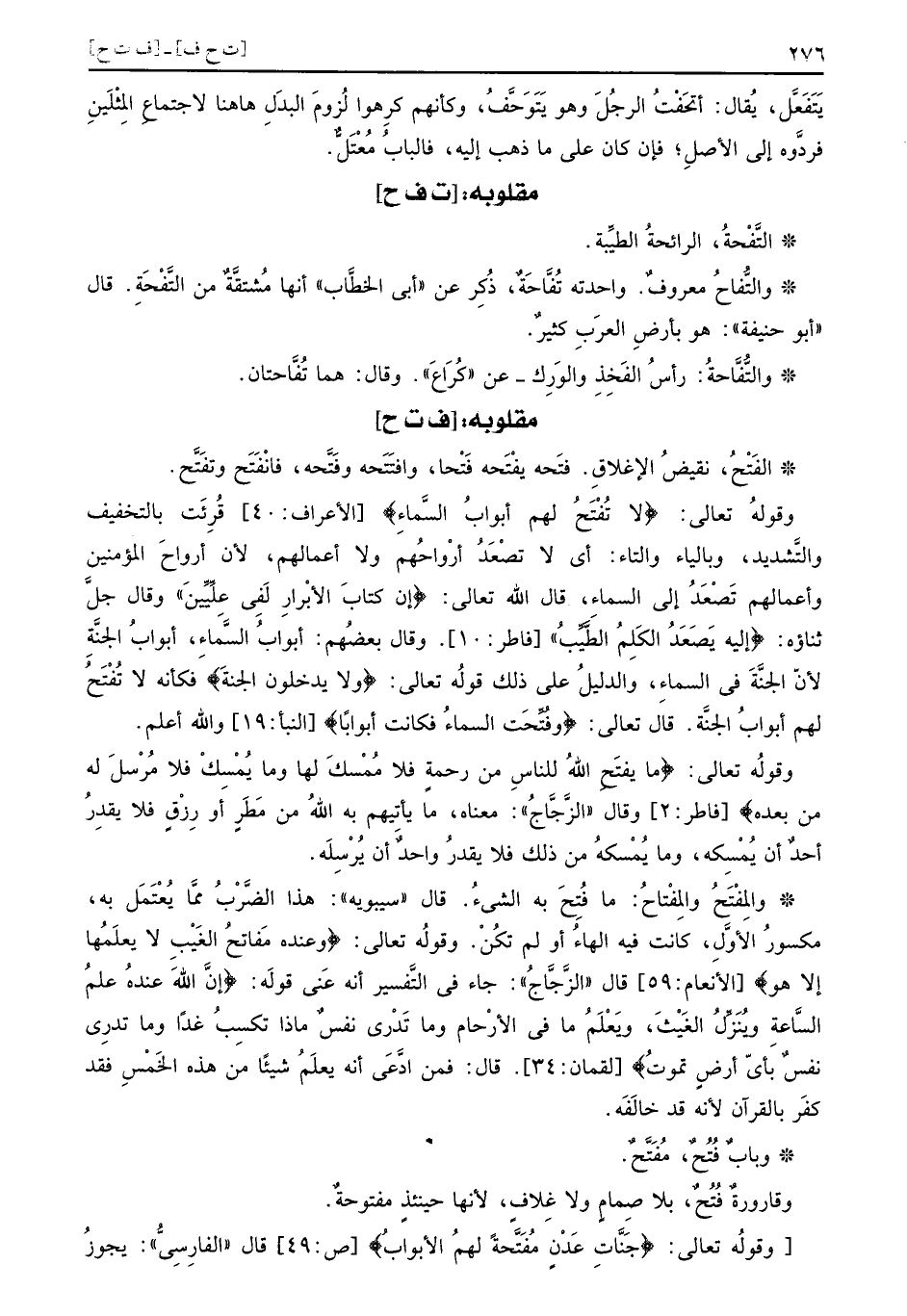 الفَتْحُ: نقيض الإغلاق. فتَحه يفْتَحه فَتْحا، وافتَتَحه وفَتَّحه، فانْفَتَح وتفَتَّح. وَقَوله تَعَالَى: (لَا تُفْتَحُ لَهُم أبوابُ السَّماءِ) قُرِئت بِالتَّخْفِيفِ وَالتَّشْدِيد، وبالياء وَالتَّاء: أَي لَا تصعد أَرْوَاحهم وَلَا أَعْمَالهم، لِأَن أَرْوَاح الْمُؤمنِينَ وأعمالهم تصعد إِلَى السَّمَاء، قَالَ الله تَعَالَى: (إِن كتابَ الأبْرارِ لَفِي عِلِّيِّينَ) وَقَالَ جلّ ثَنَاؤُهُ: (إِلَيْهِ يَصَعَدُ الكَلِمُ الطَّيِّبُ) . وَقَالَ بَعضهم: أَبْوَاب السَّمَاء، أَبْوَاب الْجنَّة لِأَن الْجنَّة فِي السَّمَاء، وَالدَّلِيل على ذَلِك قَوْله تَعَالَى: (ولَا يدْخلُونَ الجنةَ) فَكَأَنَّهُ لَا تفتح لَهُم أَبْوَاب الْجنَّة. قَالَ تَعَالَى: (وفُتِّحَت السماءُ فَكَانَت أبوابا) وَالله أعلم.