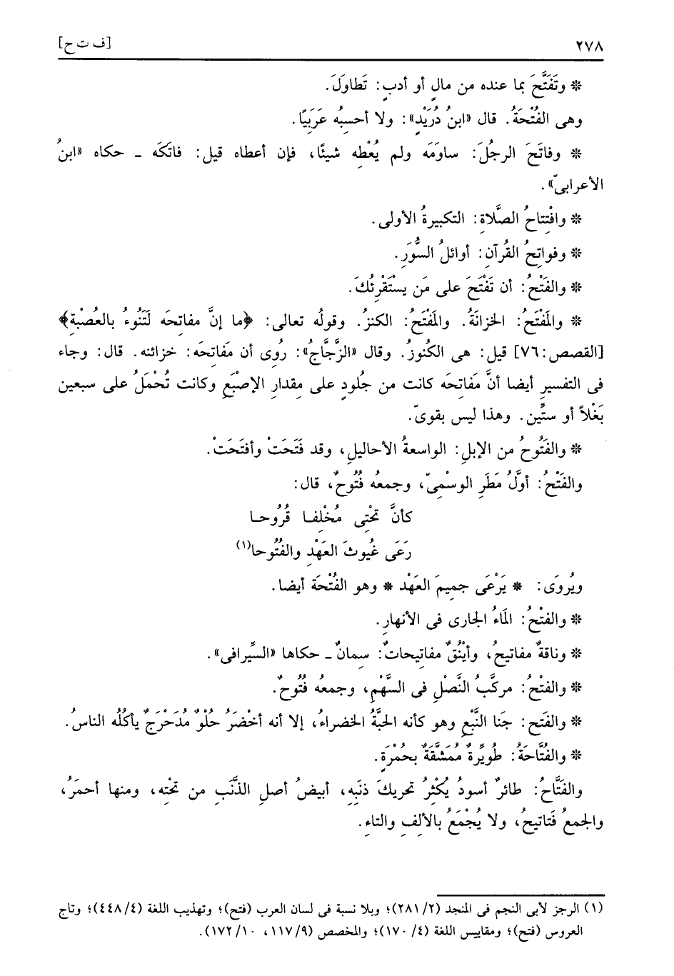 والَمْفَتحُ: الخزانة. والمَفْتَحُ: الْكَنْز. وَقَوله تَعَالَى: (مَا إنَّ مفاتِحَه لَتَنُوءُ بالعُصْبةِ) قيل: هِيَ الْكُنُوز. وَقَالَ الزّجاج: روى أَن مفاتحه: خزائنه. قَالَ: وَجَاء فِي التَّفْسِير أَيْضا أَن مفاتحه كَانَت من جُلُود على مِقْدَار الإصبع وَكَانَت تحمل على سبعين بغلا أَو سِتِّينَ. وَهَذَا لَيْسَ بِقَوي.