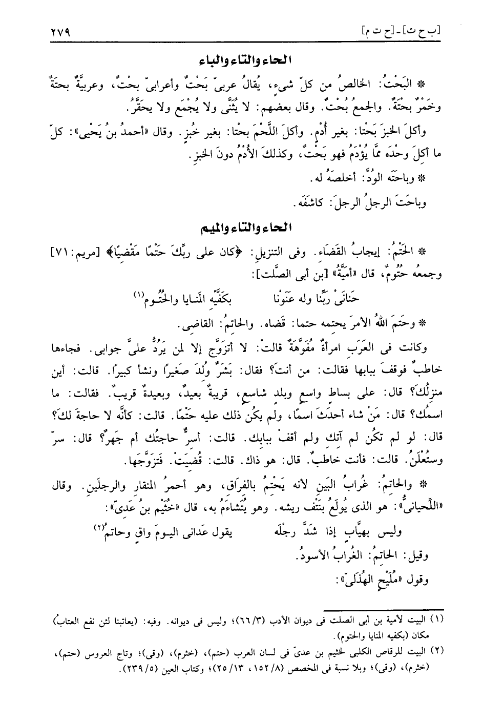 الحَتْمُ: إِيجَاب الْقَضَاء. وَفِي التَّنْزِيل: (كَانَ على ربِّكَ حَتْما مَقْضِيًّا) وَجمعه حُتُومٌ، قَالَ أُميَّة بن أبي الصَّلْت: