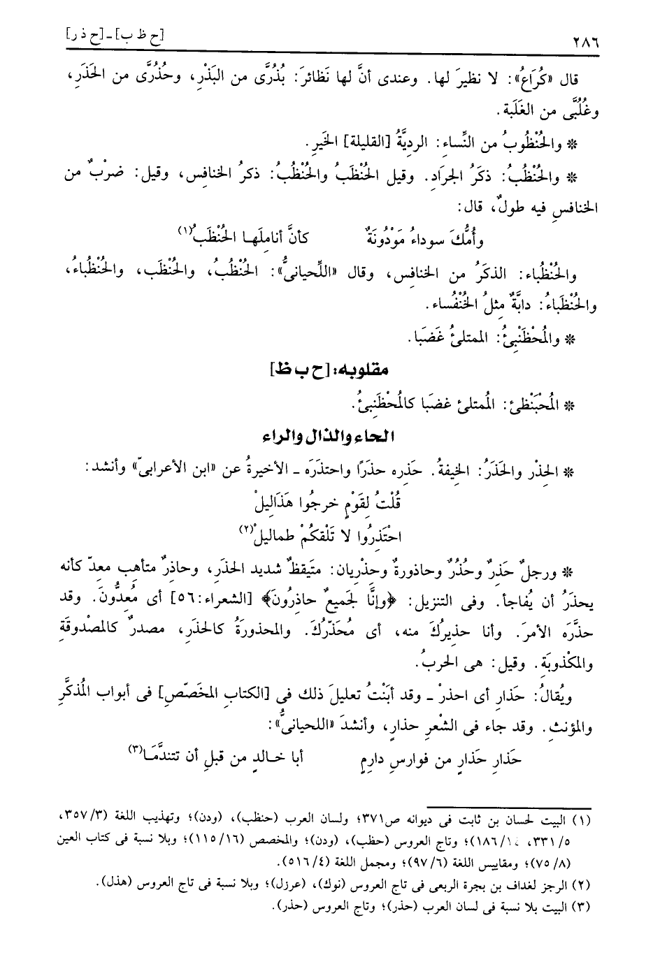ورجلٌ حَذِرٌ وحُذُرٌ وحاذورةٌ وحِذْرِيان: متيقظ شَدِيد الحذر، وحاذر متاهب معد كَأَنَّهُ يحذر أَن يفاجأ. وَفِي التَّنْزِيل: (وإنَّا لجَميعٌ حاذِرُونَ) أَي معدون. وَقد حذَّرَه الْأَمر. وَأَنا حذِيرُكَ مِنْهُ، أَي محذرك. والمحذورة كالحذر، مصدر كالمصدوقة والمكذوبة. وَقيل: هِيَ الْحَرْب.