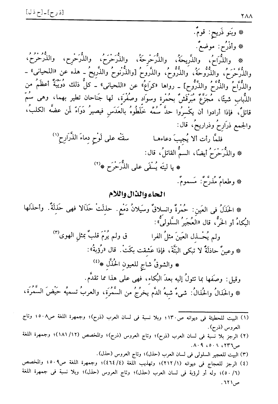 والذُّرَاحُ، والذَّرِيحَةُ، والذُّرَحْرِحَةُ، والذُّرَحْرِح، والذُّرُحْرُحُ، والذُّرَّحَرْحُ، والذُّرَّحَرْحُ، والذُّرُّوحَةُ، والذُّرّوُحُ، والذَّروحُ والذّرْنوحُ والذَّرِيحُ، هَذِه عَن الَّلحيانيّ، والذُّرَّاحٌ، والذُّرَّحُ والذَرُّوح، رَوَاهَا كرَاع عَن الَّلحيانيّ، كل ذَلِك دُوَيْبَّة أعظم من الذُّبَاب شَيْئا، مجزع مبرقش بحمرة وَسَوَاد وصفرة، لَهَا جَنَاحَانِ تطير بهما، وَهِي سم قَاتل، فَإِذا أَرَادوا أَن يكسروا حد سمه خلطوه بالعدس فَيصير دَوَاء لمن عضه الْكَلْب، وَالْجمع ذرَارِحُ وذراريحُ، قَالَ: