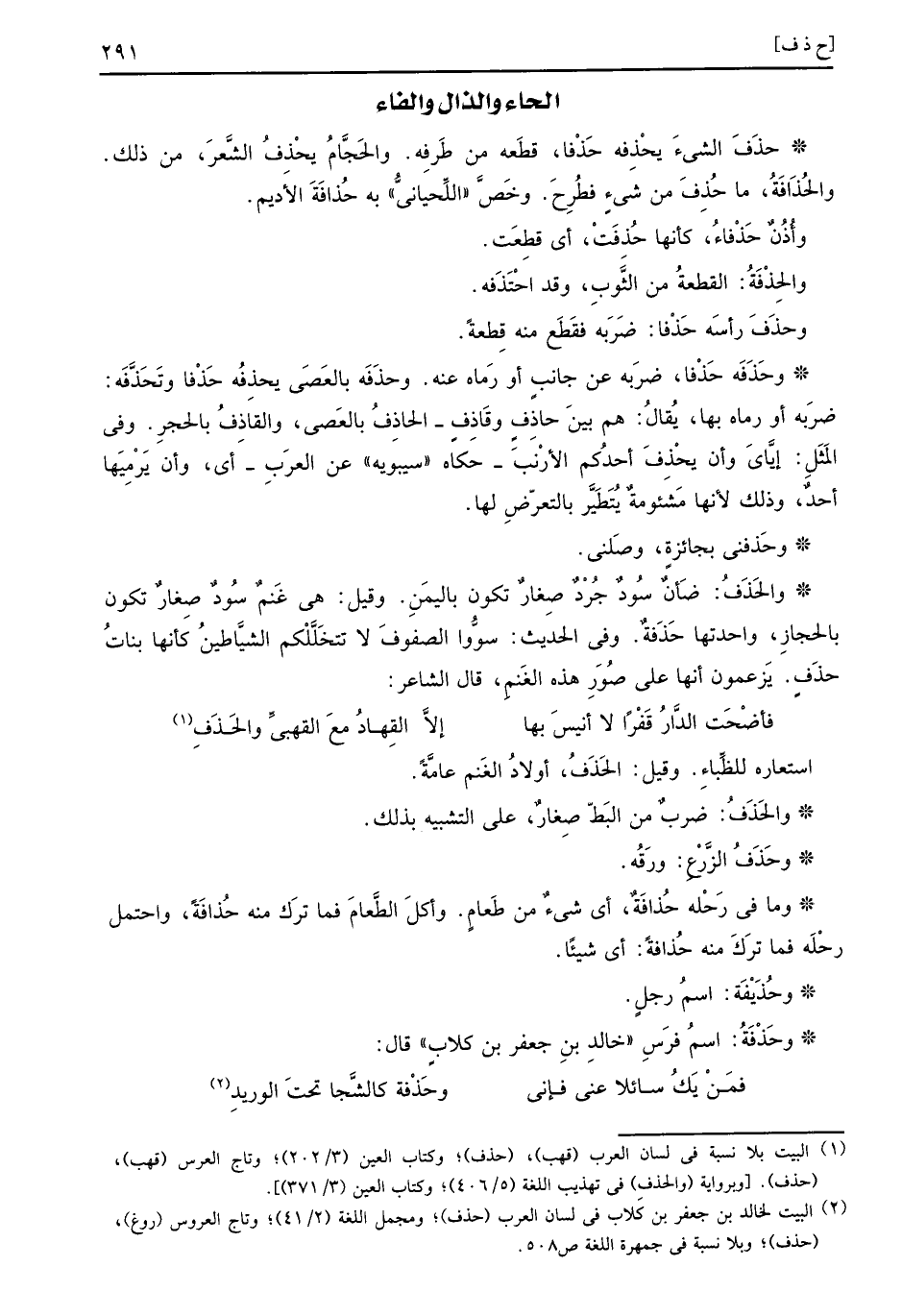 والحَذَفُ: ضَأْن سود جرد صغَار تكون بِالْيمن. وَقيل: هِيَ غنم سود صغَار تكون بالحجاز، واحدتها حَذَفةٌ. وَفِي الحَدِيث: سووا الصُّفُوف لَا تتخللكم الشَّيَاطِين كَأَنَّهَا بَنَات حذَفٍ. يَزْعمُونَ إِنَّهَا على صور هَذِه الْغنم، قَالَ الشَّاعِر: