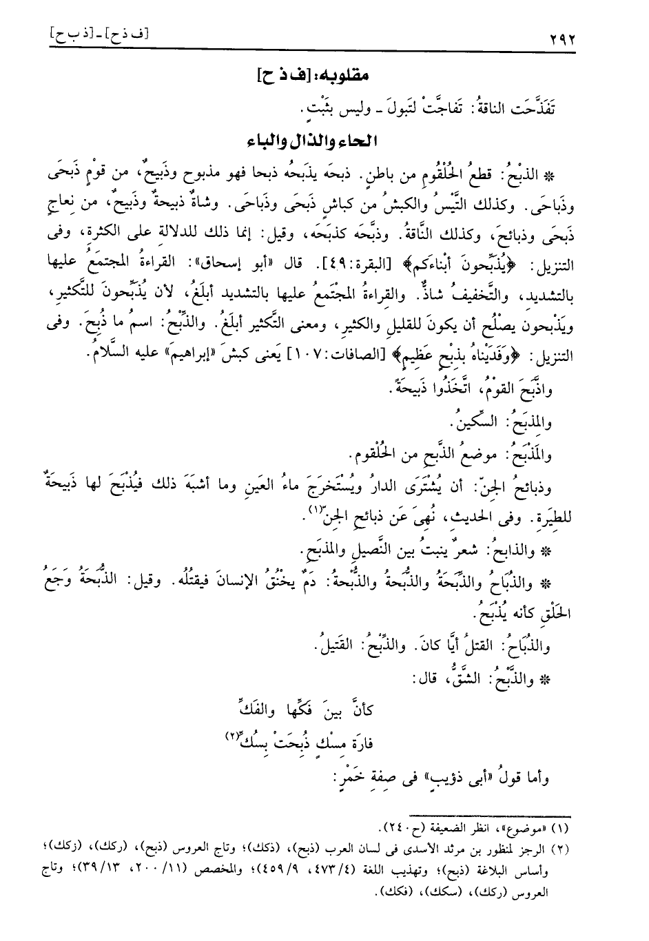 الذبْحُ: قطع الْحُلْقُوم من بَاطِن. ذبحَه يذَبحُه ذبحا فَهُوَ مَذْبُوح وذَبيحٌ، من قوم ذَبحَى وذَباحَي. وَكَذَلِكَ التيس والكبش من كباش ذَبحَى وذَباحَي. وشَاة ذبيحةٌ وذَبيحٌ، من نعاج ذَبحَى وذبائحَ، وَكَذَلِكَ النَّاقة. وذبَّحَه كذَبَحَه، وَقيل: إِنَّمَا ذَلِك للدلالة على الْكَثْرَة، وَفِي التَّنْزِيل: (يُذَبِّحونَ أبْناءَكم) وَقد قريء: (يَذْبحُونَ أبناءكم) . قَالَ أَبُو إِسْحَاق: الْقِرَاءَة الْمُجْتَمع عَلَيْهَا بِالتَّشْدِيدِ، وَالتَّخْفِيف شَاذ. وَالْقِرَاءَة الْمُجْتَمع عَلَيْهَا بِالتَّشْدِيدِ أبلغ، لِأَن يُذَبِّحونَ للتكثير، ويَذْبحون يصلح أَن يكون للقليل وَالْكثير، وَمعنى التكثير أبلغ.