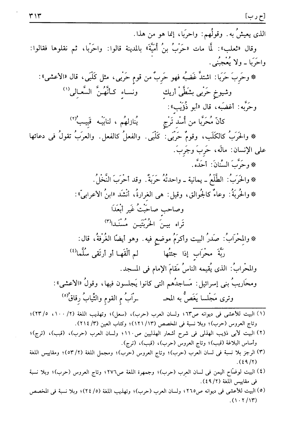 وحَرِبَ حَرَبا: اشْتَدَّ غَضَبه فَهُوَ حَرِبٌ من قوم حَرْبى، مثل كَلْبِي، قَالَ الْأَعْشَى: