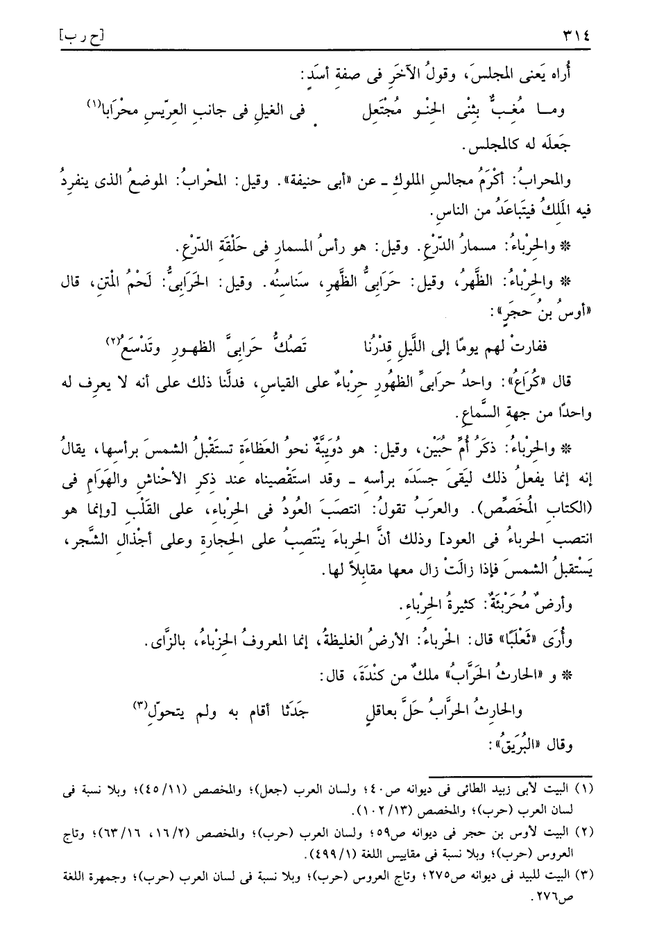 والحِرْباءُ: ذكر أم حبين، وَقيل: هُوَ دُوَيْبَّة نَحْو العظاءة تسْتَقْبل الشَّمْس برأسها، يُقَال انه إِنَّمَا يفعل ذَلِك ليقي جسده بِرَأْسِهِ، وَقد استقصيناه عِنْد ذكر الأحناش والهوام فِي الْكتاب الْمُخَصّص. وَالْعرب تَقول: انتصب الْعود فِي الحرباء، على الْقلب وَإِنَّمَا هُوَ انتصب الحرباء فِي الْعود وَذَلِكَ أَن الحرباء ينْتَصب على الْحِجَارَة وعَلى أجذال الشّجر، يسْتَقْبل الشَّمْس فَإِذا زَالَت زَالَ مَعهَا مُقَابلا لَهَا.