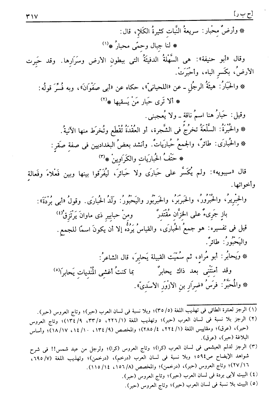 قيل فِي تَفْسِيره: وَهُوَ جمع الحُبارَي، وَالْقِيَاس يردهُ إِلَّا أَن يكون اسْما للْجمع.