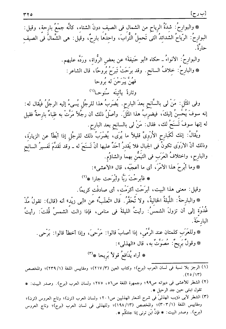 والبوارِحُ: شدَّة الرِّيَاح من الشمَال فِي الصَّيف دون الشتَاء، كَأَنَّهُ جمع بارِحةٍ، وَقيل: البوارِحُ، الرِّيَاح الشدائد الَّتِي تحمل التُّرَاب، وَاحِدهَا بارح، وَقيل: هِيَ الشمَال فِي الصَّيف حارة.
