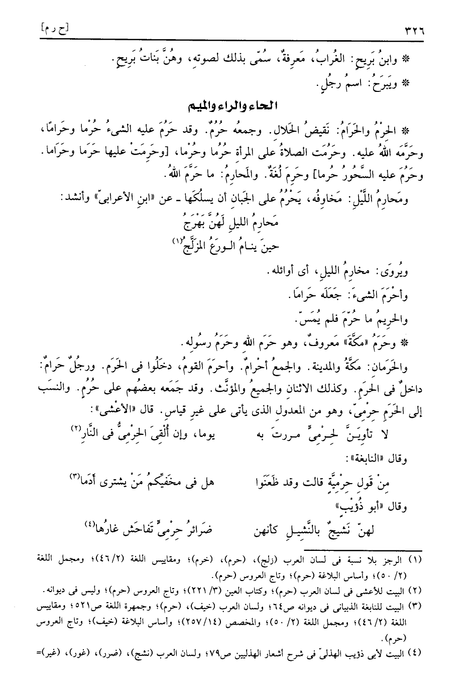 الحِرْمُ والحَرَامُ: نقيض الْحَلَال. وَجمعه حُرُمٌ. وَقد حَرُمَ عَلَيْهِ الشَّيْء حُرْما وحَراما، وحَرَّمَه الله عَلَيْهِ. وحَرُمَت الصَّلَاة على الْمَرْأَة حُرُما وحُرْما، وحَرِمَتْ عَلَيْهَا حَرَما وحَرَاما. وحَرُمَ عَلَيْهِ السّحُور حُرما وحَرِمَ لُغَة. والمَحارِمُ: مَا حَرَّمَ الله.