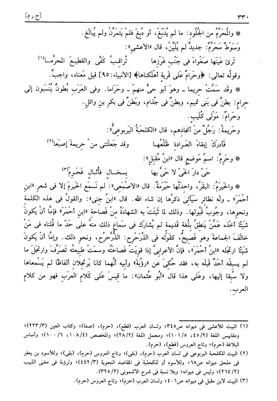 والحَيرَمُ: الْبَقر، واحدتها حَيِرَمةٌ. قَالَ الْأَصْمَعِي: لم نسْمع الحَيرمَ إِلَّا فِي شعر ابْن أَحْمَر، وَله نَظَائِر سَيَأْتِي ذكرهَا إِن شَاءَ الله. قَالَ ابْن جني: وَالْقَوْل فِي هَذِه الْكَلِمَة وَنَحْوهَا، وجوب قبُولهَا. وَذَلِكَ لما ثبتَتْ بِهِ الشَّهَادَة من فصاحة ابْن أَحْمَر فإمَّا أَن يكون شَيْئا أَخذه عَمَّن ينْطق بلغَة قديمَة لم يُشَارك فِي سَماع ذَلِك مِنْهُ على حد مَا قُلْنَاهُ فِي من خَالف الْجَمَاعَة وَهُوَ فصيح، كَقَوْلِه فِي الذُرَحْرِح: الذُّرَّحرُح، وَنَحْو ذَلِك. وَإِمَّا أَن يكون شَيْئا ارتجله ابْن أَحْمَر، فَإِن ابْن الْأَعرَابِي إِذا قويت فَصَاحَته وسمت طَبِيعَته تصرف وارتجل مَا لم يسْبقهُ أحد قبله بِهِ، فقد حُكيَ عَن رؤبة وَأَبِيهِ انهما كَانَا يرتجلان ألفاظا لم يسمعاها وَلَا سبقا إِلَيْهَا، وعَلى هَذَا قَالَ أَبُو عُثْمَان: مَا قيس على كَلَام الْعَرَب فَهُوَ من كَلَام الْعَرَب.