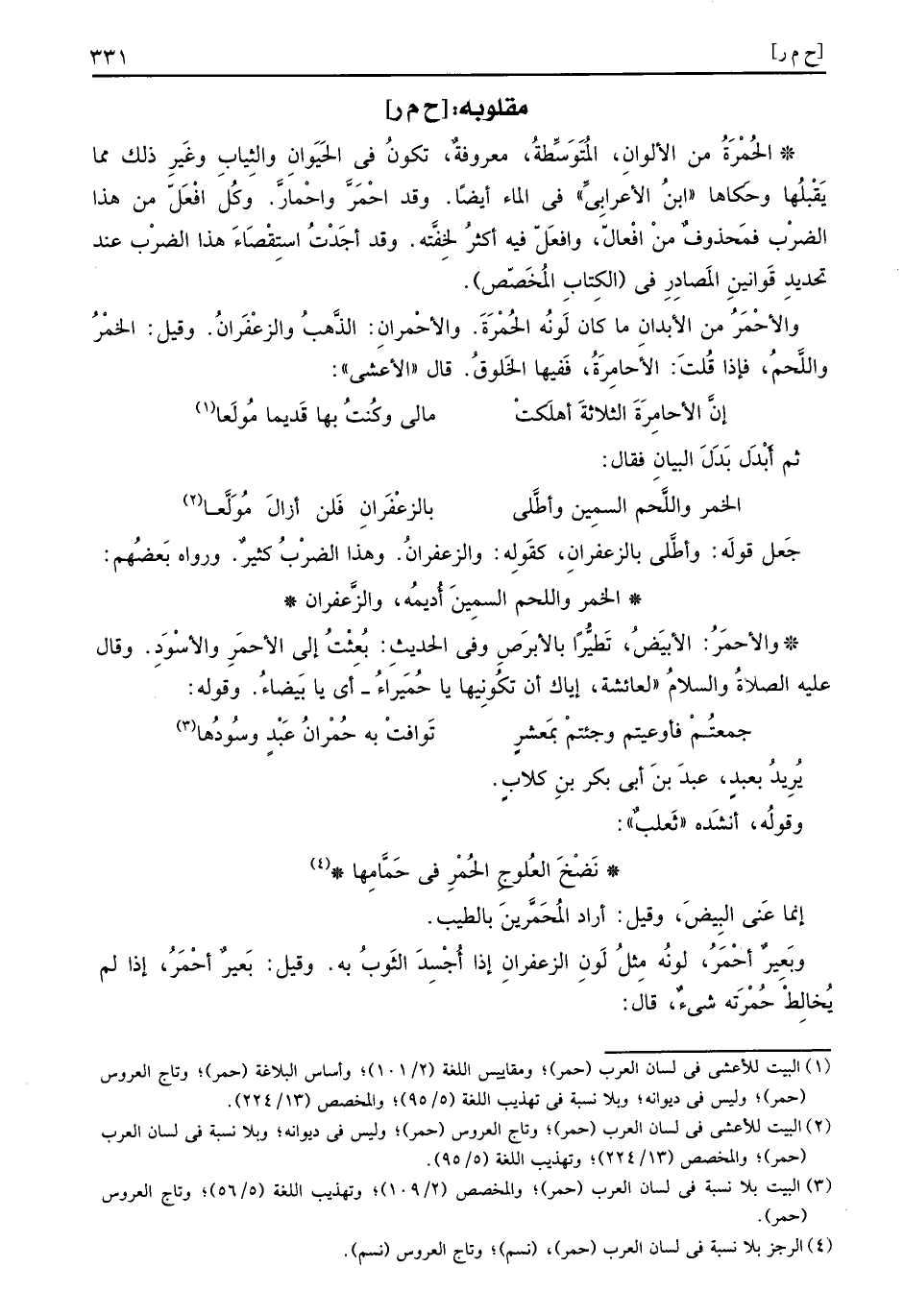 الحُمْرَةُ من الألوان، المتوسطة، مَعْرُوفَة، تكون فِي الْحَيَوَان وَالثيَاب وَغير ذَلِك مِمَّا يقبلهَا وحكاها ابْن الْأَعرَابِي فِي المَاء أَيْضا. وَقد أَحْمَر واحمارَّ. وكل أفعل من هَذَا الضَّرْب فمحذوف من أَفعَال، وأفعل فِيهِ أَكثر لخفته. وَقد أَجدت استقصاء هَذَا الضَّرْب عِنْد تَحْدِيد قوانين المصادر فِي " الْكتاب الْمُخَصّص ".