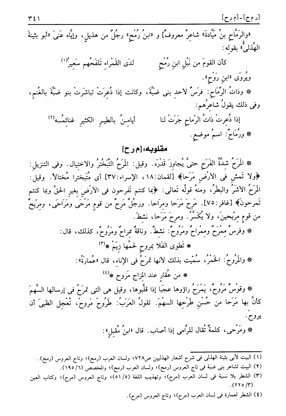 المَرَحُ شدَّة الْفَرح حَتَّى يُجَاوز قدره. وَقيل: المَرَحُ التَّبَخْتُر والاختيال. وَفِي التَّنْزِيل: (ولَا تَمشيِ فِي الأْرضِ مَرَحا) أَي متبخترا مختالا. وَقيل: المَرَحُ الأشر والبطر، وَمِنْه قَوْله تَعَالَى: (بِمَا كُنْتُم تَفرحون فِي الأرْضِ بِغيرِ الحقِّ وَبِمَا كُنْتُم تَمرحونَ) . مَرِحَ مَرَحا ومِرَاحا. وَرجل مَرِحٌ من قوم مَرْحَى ومَرَاحَي، ومِرّيحٌ من قوم مِرّيحينَ، وَلَا يكسر ومِرِحَ مَرَحا، نشط.