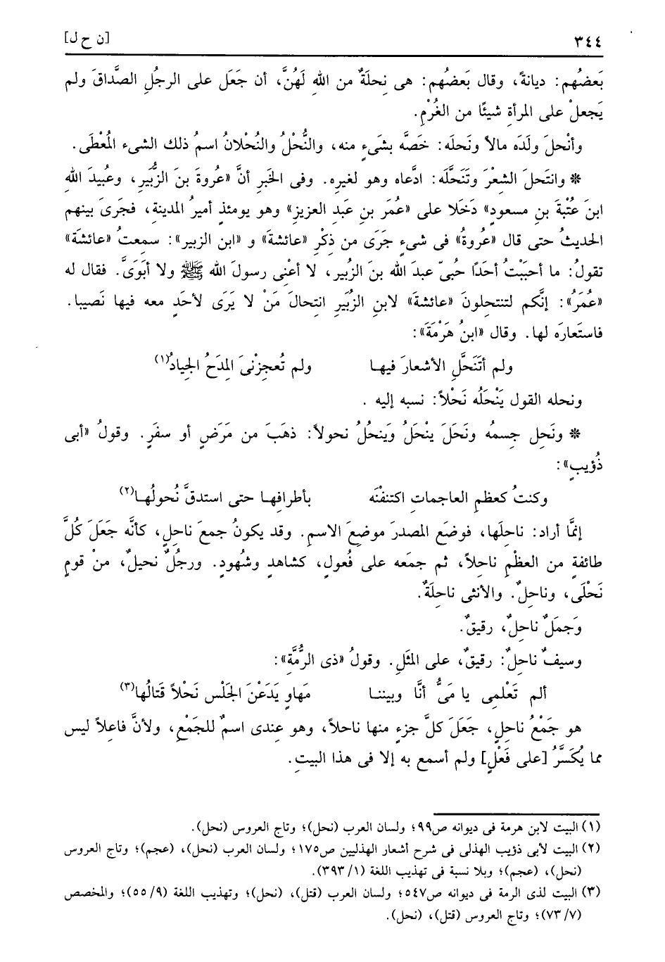 وانتَحلَ الشّعْر وتَنَحَّلَه: ادَّعَاهُ وَهُوَ لغيره. وَفِي الْخَبَر أَن عُرْوَة بن الزبير، وَعبيد الله بن عتبَة بن مَسْعُود دخلا على عمر بن عبد الْعَزِيز وَهُوَ يَوْمئِذٍ أَمِير الْمَدِينَة، فَجرى بَينهم الحَدِيث حَتَّى قَالَ عُرْوَة فِي شَيْء جرى من ذكر عَائِشَة وَابْن الزبير: سَمِعت عَائِشَة تَقول: مَا أَحْبَبْت أحدا حبي عبد الله ابْن الزبير، لَا أَعنِي رَسُول الله صَلَّى اللهُ عَلَيْهِ وَسَلَّمَ وَلَا أَبَوي. فَقَالَ لَهُ عمر: إِنَّكُم لتنتحِلونَ عَائِشَة لِابْنِ الزبير انِتحالَ من لَا يرى لأحد مَعَه فِيهَا نَصِيبا. فاستعاره لَهَا. وَقَالَ ابْن هرمة: