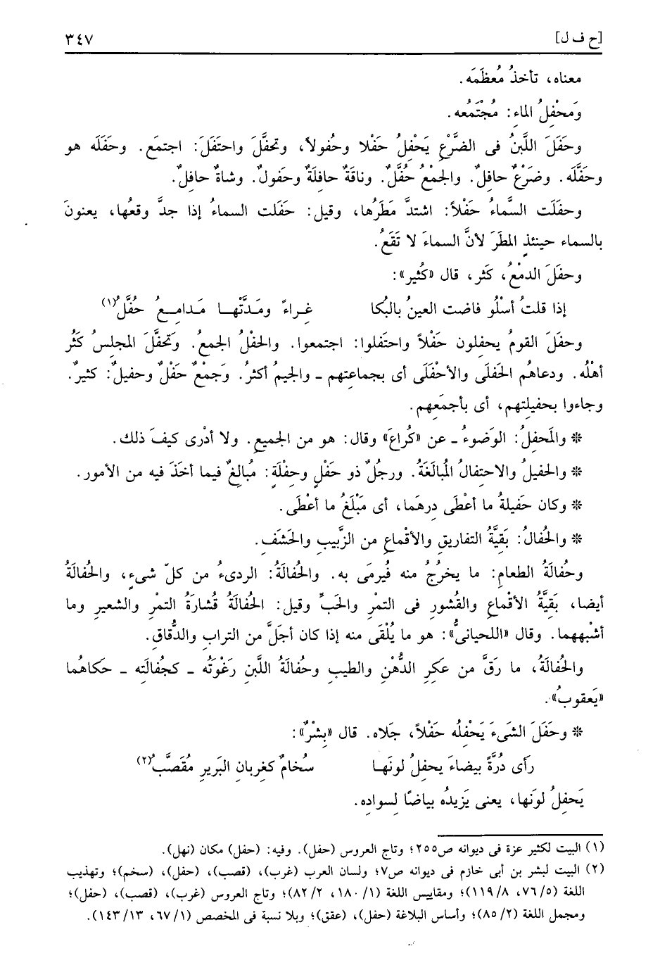 وحَفَلَ اللَّبن فِي الضَّرع يَحْفِلُ حَفْلا وحُفولاً، وتحفَّلَ واحتَفَلَ: اجْتمع. وحَفَلَه هُوَ وحَفَّلَه. وضرع حافِلٌ. وَالْجمع حُفَّلٌ. وناقة حافِلَةٌ وحَفولٌ. وشَاة حافِلٌ.