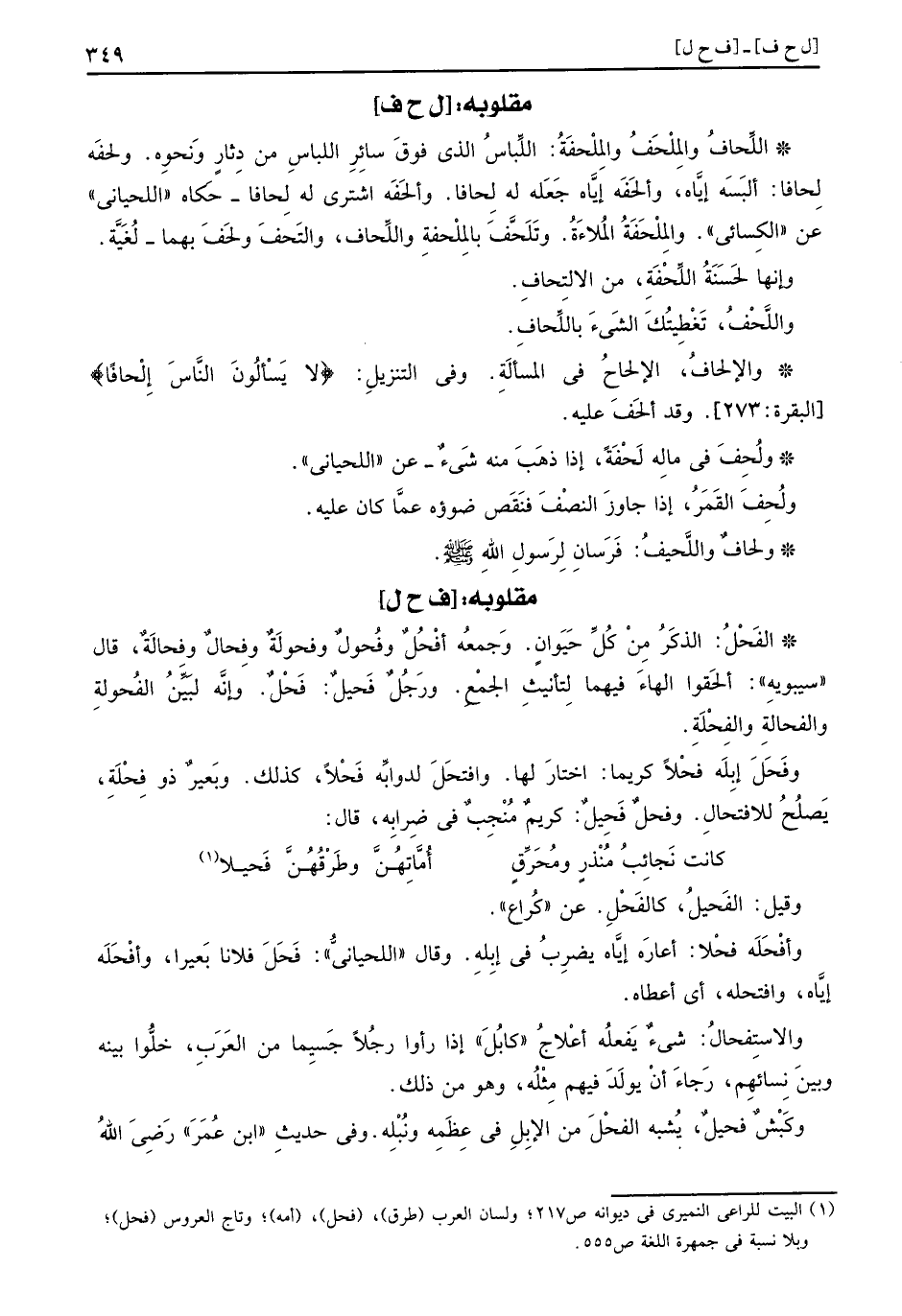 اللِّحافُ والمِلْحَفُ والمِلَحفَةُ: اللبَاس الَّذِي فَوق سَائِر اللبَاس من دثار وَنَحْوه. ولحفَه لِحافا: ألبسهُ إِيَّاه، وألحَفَه إِيَّاه جعله لَهُ لِحافا. وألحَفَه اشْترى لَهُ لِحافا، حَكَاهُ الَّلحيانيّ عَن الْكسَائي. والمِلْحَفَةُ الملاءة. وتَلَحَّفَ بالمِلْحفةِ واللِّحاف، والتَحفَ ولحَفَ بهما، لغية.