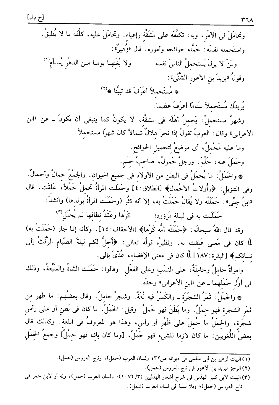 والحَمْلُ: مَا يُحمَلُ فِي الْبَطن من الْأَوْلَاد فِي جَمِيع الْحَيَوَان. وَالْجمع حِمالٌ وأحمالٌ. وَفِي التَّنْزِيل: (وأُولاتُ الأْحمالِ) وحَمَلت الْمَرْأَة تحمِلُ حَمْلاً، علقت، قَالَ ابْن جني: حَمَلَتْه وَلَا يُقَال حَمَلَتْ بِهِ، إِلَّا انه كثر " وحَمَلَت المرأةُ بولدِها " وَأنْشد: