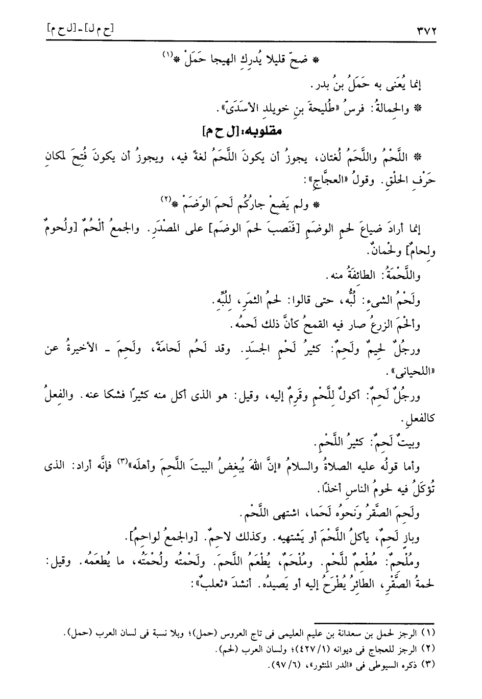 إِنَّمَا أَرَادَ ضيَاع لحم الْوَضم فنصب لحم الْوَضم على الْمصدر. وَالْجمع ألْحُمٌ ولُحومٌ ولِحامٌ ولحْمانٌ.