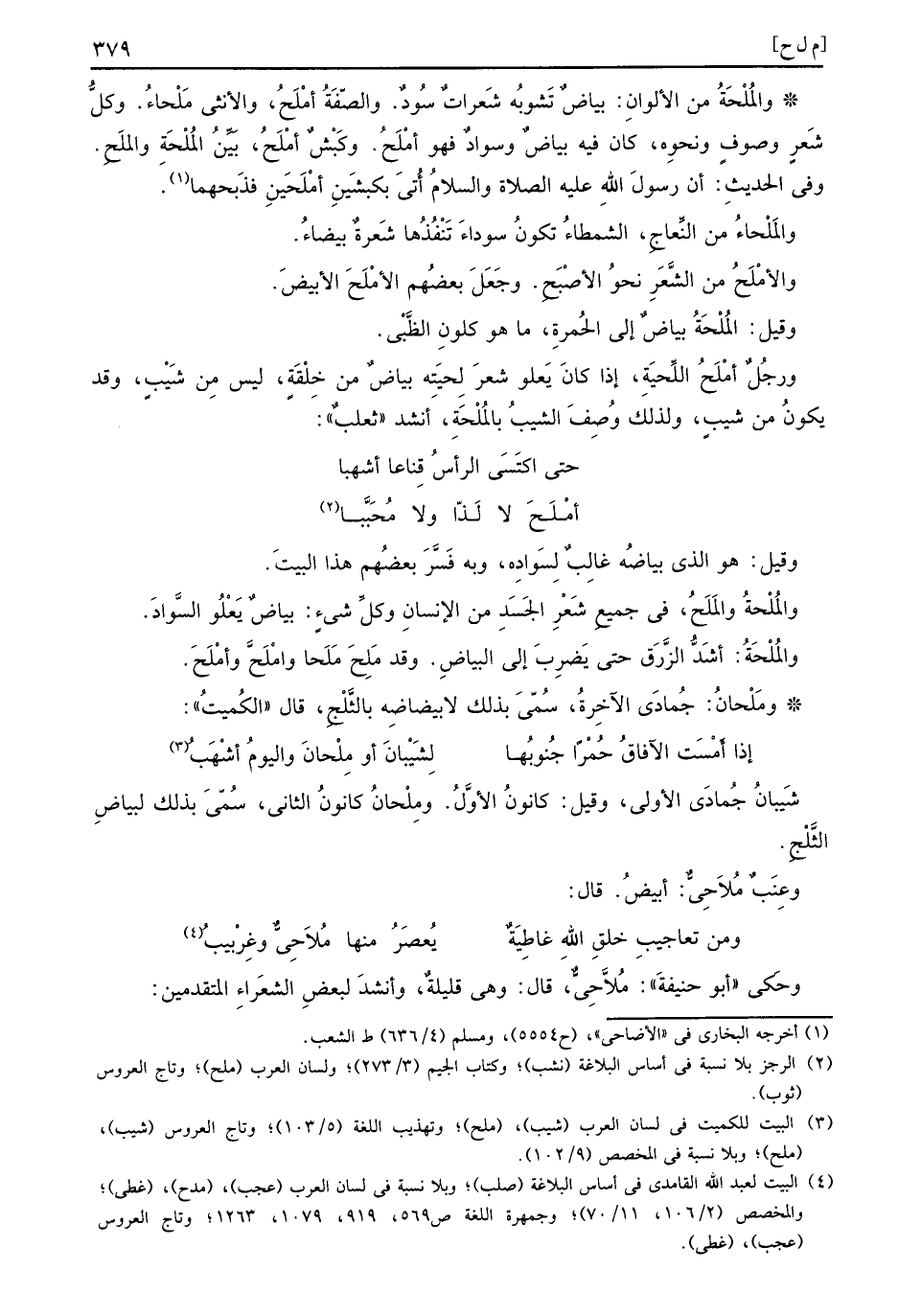 والمُلْحَةُ من الألوان: بَيَاض تشوبه شَعرَات سود. وَالصّفة أمْلَحُ، وَالْأُنْثَى مَلْحاءُ. وكل شعر وصوف وَنَحْوه، كَانَ فِيهِ بَيَاض وَسَوَاد فَهُوَ أمْلَحُ. وكبش أمْلَحُ، بيِّن المُلْحَةِ والملَحِ. وَفِي الحَدِيث: أَن رَسُول الله عَلَيْهِ الصَّلَاة وَالسَّلَام أَتَى بكبشين أمْلَحَينِ فذبحهما.