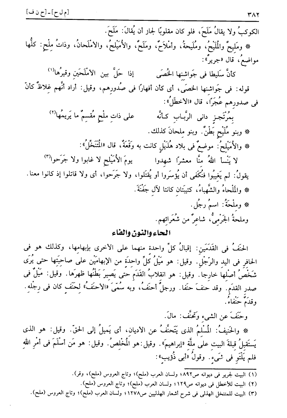 والحَنيفُ: الْمُسلم الَّذِي يَتَحنَّفُ عَن الْأَدْيَان، أَي يمِيل إِلَى الْحق. وَقيل: هُوَ الَّذِي يسْتَقْبل قبْلَة الْبَيْت على مِلَّة إِبْرَاهِيم.
