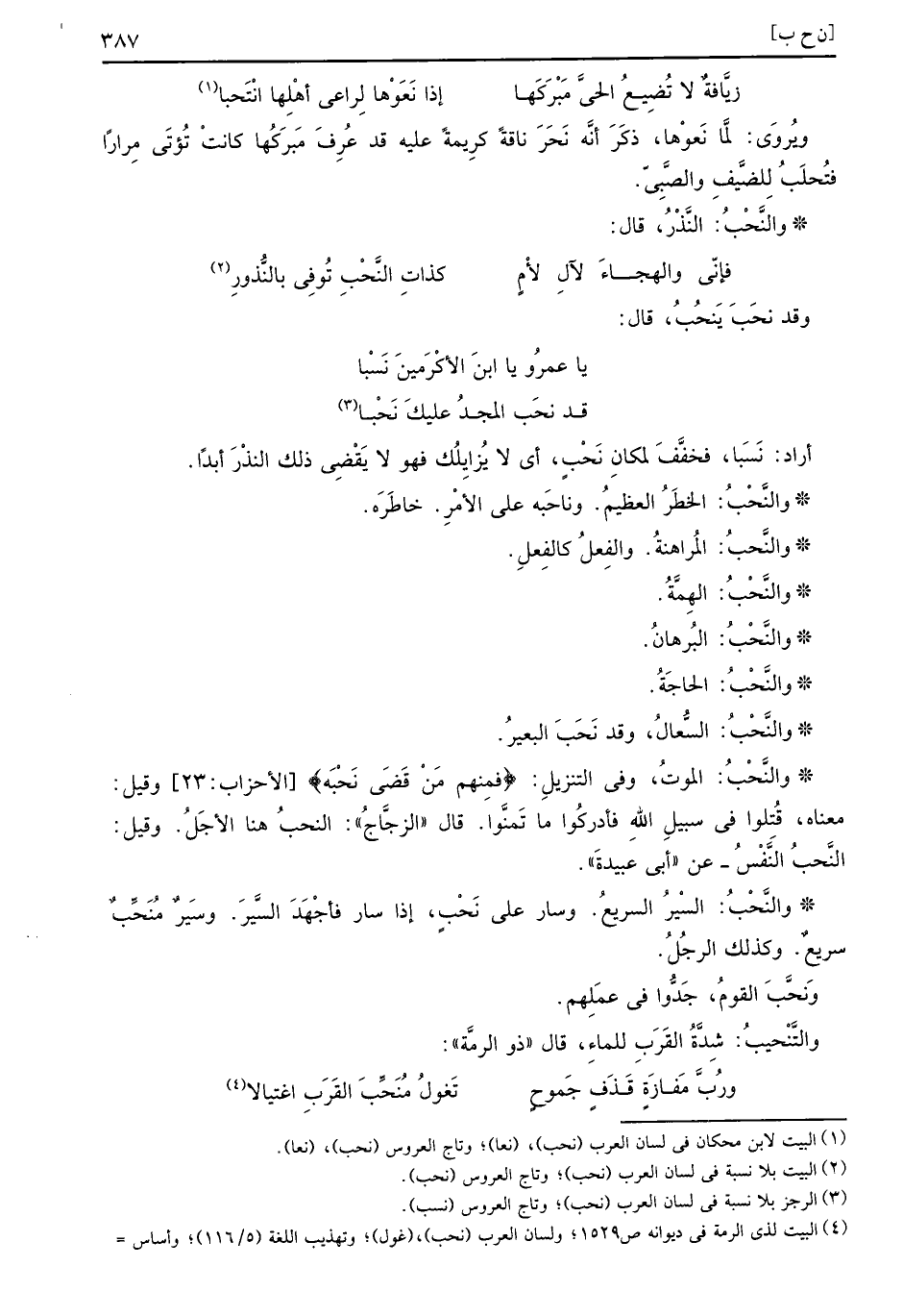 والنَّحْبُ: الْمَوْت، وَفِي التَّنْزِيل: (فمِنهم مَنْ قَضَى نَحْبَه) وَقيل: مَعْنَاهُ، قتلوا فِي سَبِيل الله فأدركوا مَا تمنوا. قَالَ الزّجاج: النحبُ هُنَا الْأَجَل. وَقيل: النَّحبُ النَّفْسُ، عَن أبي عُبَيْدَة.