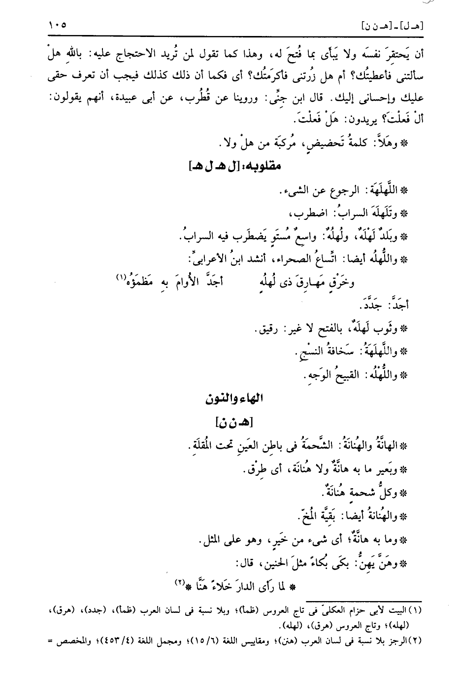 أَن يحتقر نَفسه وَلَا يبأى بِمَا فتح لَهُ، وَهَذَا كَمَا تَقول لمن تُرِيدُ الِاحْتِجَاج عَلَيْهِ: بِاللَّه هَل سَأَلتنِي فأعطيتك؟ أم هَل زرتني فأكرمتك؟ أَي فَكَمَا أَن ذَلِك كَذَلِك فَيجب أَن تعرف حَقي عَلَيْك وإحساني إِلَيْك. قَالَ ابْن جني: وروينا عَن قطرب، عَن أبي عُبَيْدَة، انهم يَقُولُونَ: ألْ فعلت؟ يُرِيدُونَ: هَلْ فعلت.