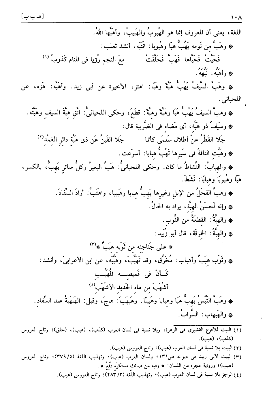 اللُّغَة، يَعْنِي أَن الْمَعْرُوف إِنَّمَا هُوَ الهُبوبُ والهَبيبُ، وأهَبَّها الله.
