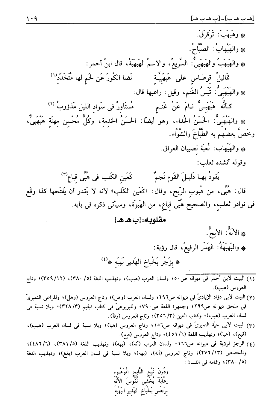 والهَبهَبُ والهَبهَبِيُّ: السَّرِيع، وَالِاسْم الهَبهَبَةُ، قَالَ ابْن أَحْمَر: