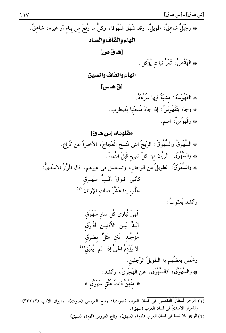 والسَّهْوَقُ: الطَّوِيل من الرِّجَال، وتستعمل فِي غَيرهم، قَالَ المرار الْأَسدي: