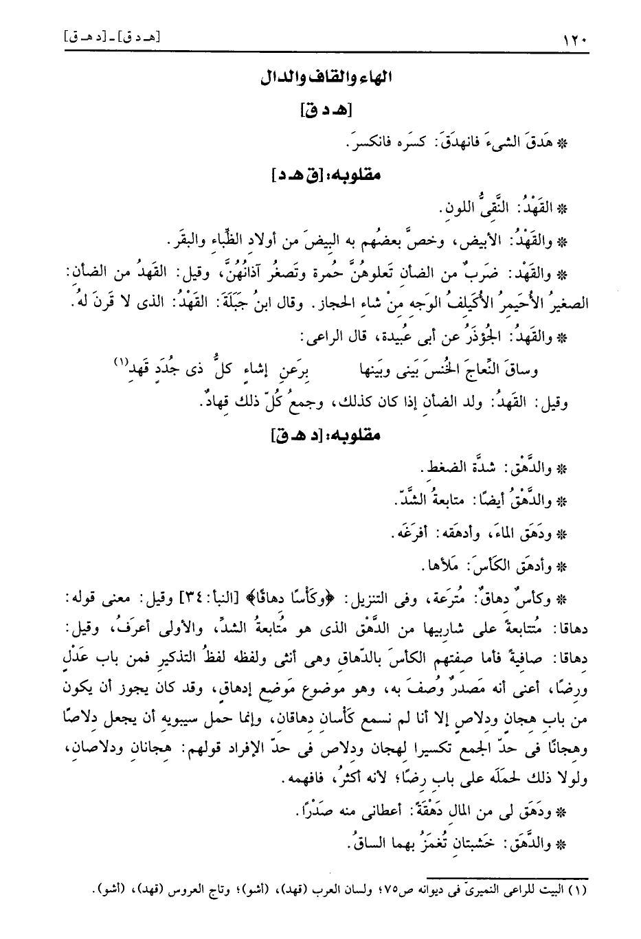 وكأس دِهاقٌ: مترعة، وَفِي التَّنْزِيل: (وكأْساً دِهاقاً) وَقيل: معنى قَوْله: دهاقا: متتابعة على شاربيها من الدَّهْق الَّذِي هُوَ مُتَابعَة الشد، وَالْأولَى أعرف، وَقيل: دِهاقا: صَافِيَة فَأَما صفتهمْ الكأس بالدّهاقِ وَهِي أُنْثَى وَلَفظه لفظ التَّذْكِير فَمن بَاب عدل ورضا، أَعنِي أَنه مصدر وصف بِهِ، وَهُوَ مَوْضُوع مَوضِع إدهاق، وَقد كَانَ يجوز أَن يكون من بَاب هجان ودلاص إِلَّا أَنا لم نسْمع كأسان دهاقان، وَإِنَّمَا حمل سِيبَوَيْهٍ أَن يَجْعَل دلاصا وهجانا فِي حد الْجمع تكسيرا لهجان ودلاص فِي حد الْإِفْرَاد قَوْلهم: هجانان ودلاصان، وَلَولَا ذَلِك لحمله على بَاب رضَا، لِأَنَّهُ أَكثر، فافهمه.