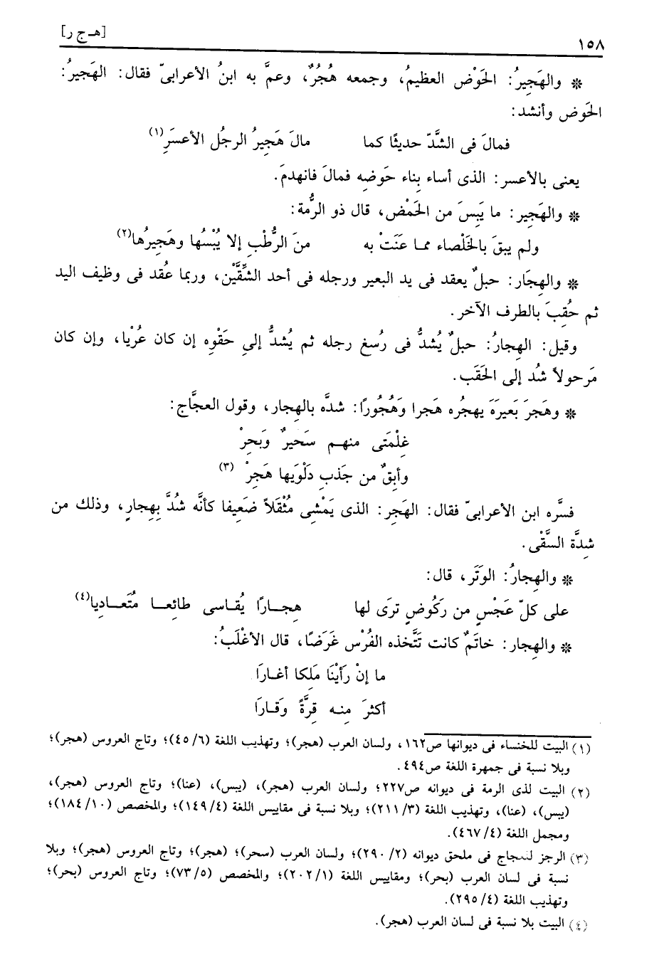 فسره ابْن الْأَعرَابِي فَقَالَ: الهَجِر: الَّذِي يمشي مُثقلًا ضَعِيفا كَأَنَّهُ شدّ بِهِجارٍ، وَذَلِكَ من شدَّة السَّقْي.