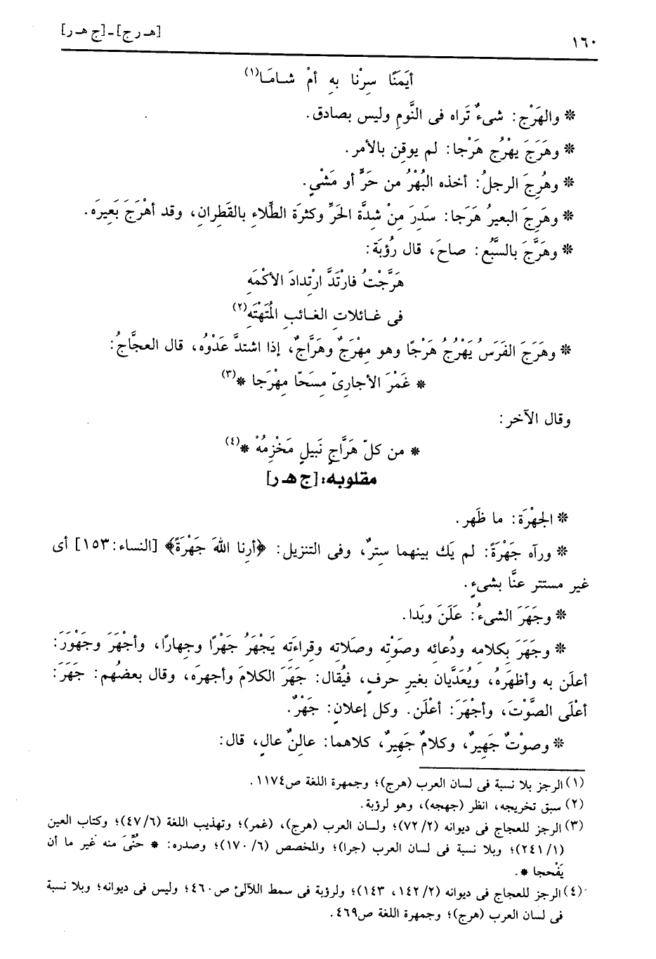 وجَهَرَ بِكَلَامِهِ ودعائه وصوته وَصلَاته وقراءته يَجْهَرُ جَهْراً وجِهاراً، وأجْهَرَ وجَهْوَرَ: أعلن بِهِ وأظهره، ويعديان بِغَيْر حرف، فَيُقَال: جهر الْكَلَام وأجهره، وَقَالَ بَعضهم: جَهَرَ: أَعلَى الصَّوْت، وأجْهَرَ: أعلن. وكل إعلان: جَهْرٌ.