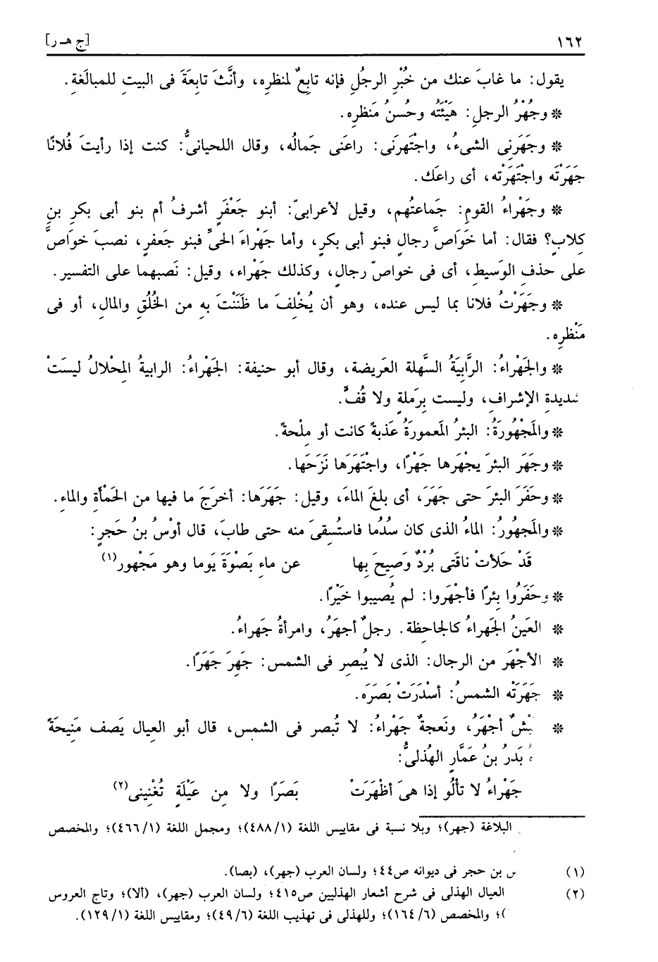 وكبش أجْهَرُ، ونعجة جَهْراءُ: لَا تبصر فِي الشَّمْس، قَالَ أَبُو الْعِيَال يصف منيحة منحها إِيَّاه بدر بن عمار الْهُذلِيّ: