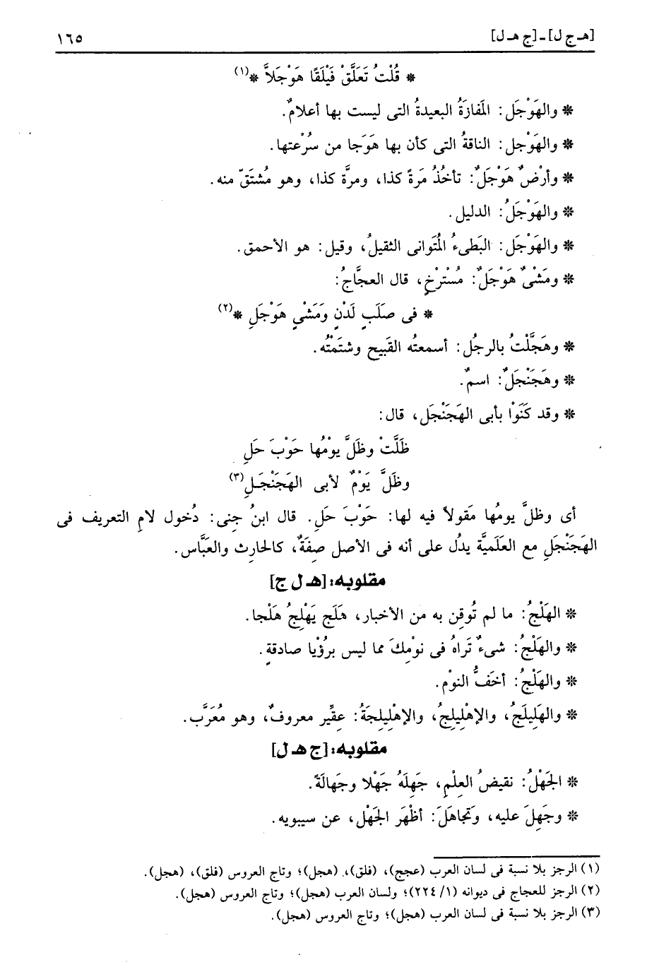 أَي وظل يَوْمهَا مقولا فِيهِ لَهَا: حَوْبَ حل. قَالَ ابْن جني: دُخُول لَام التَّعْرِيف فِي الهجنجل مَعَ العلمية يدل على انه فِي الأَصْل صفة، كالحارث وَالْعَبَّاس.