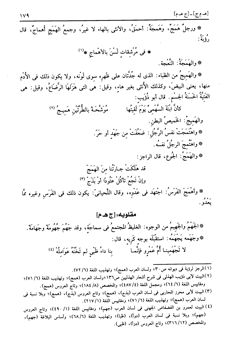 وَرجل هَمَجٌ، وهَمَجَةٌ: أَحمَق، وَالْأُنْثَى بِالْهَاءِ لَا غير، وَجمع الهَمَجِ أهْماجٌ، قَالَ رؤبة: