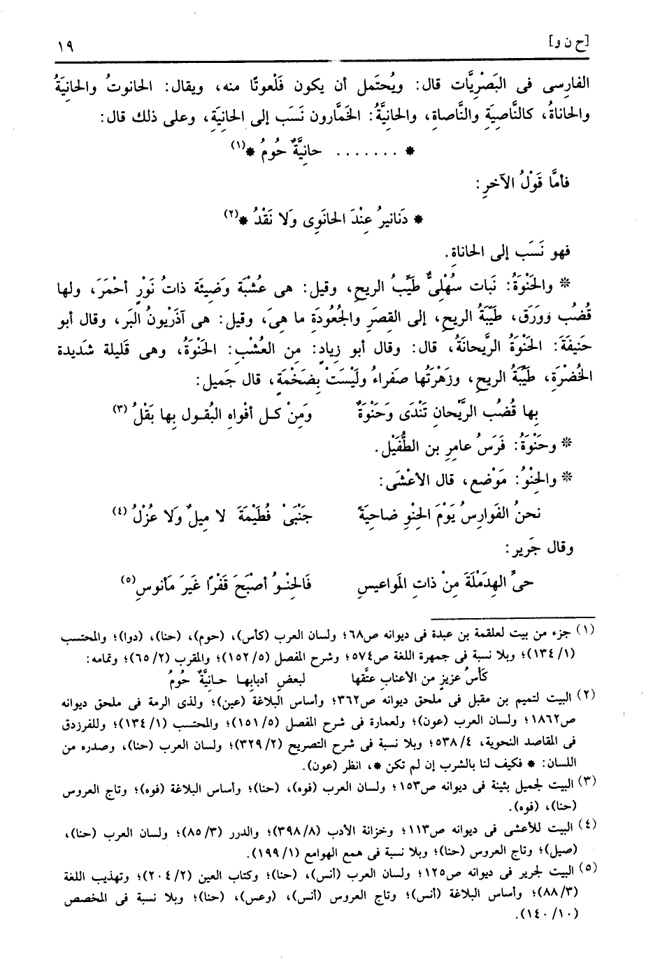 الْفَارِسِي فِي البصريات قَالَ: وَيحْتَمل أَن يكون فَلْعوتاً مِنْهُ، وَيُقَال: الحانوتُ والحانِيَةُ والحاناةُ، كالناصية والناصاة، والحانِيَّةُ: الخمارون نسب إِلَى الحانِيَةِ، وعَلى ذَلِك قَالَ: