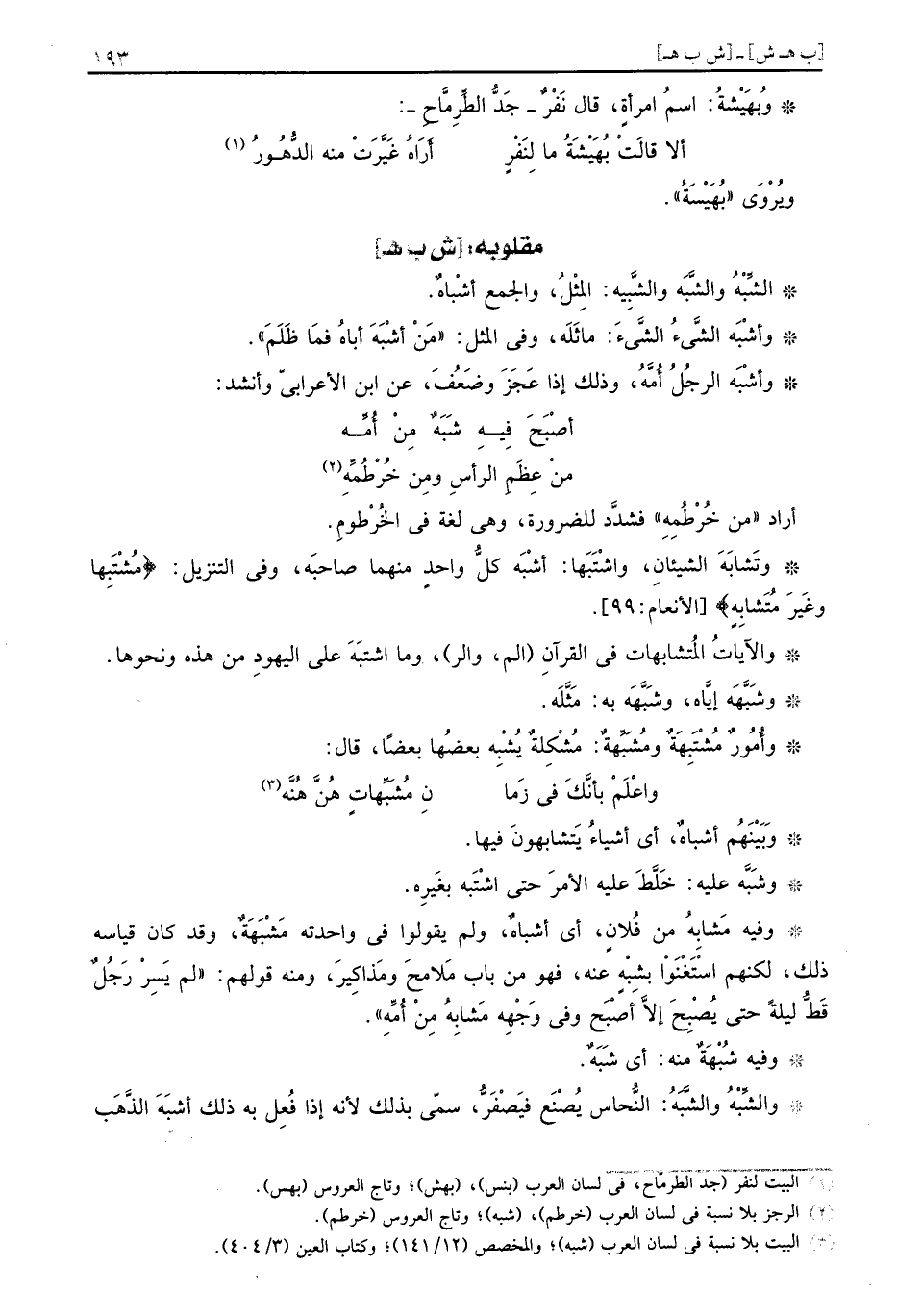 وَأُمُور مُشْتَبِهَةٌ ومُشَبِّهةٌ: مشكلة يشبه بَعْضهَا بَعْضًا، قَالَ: