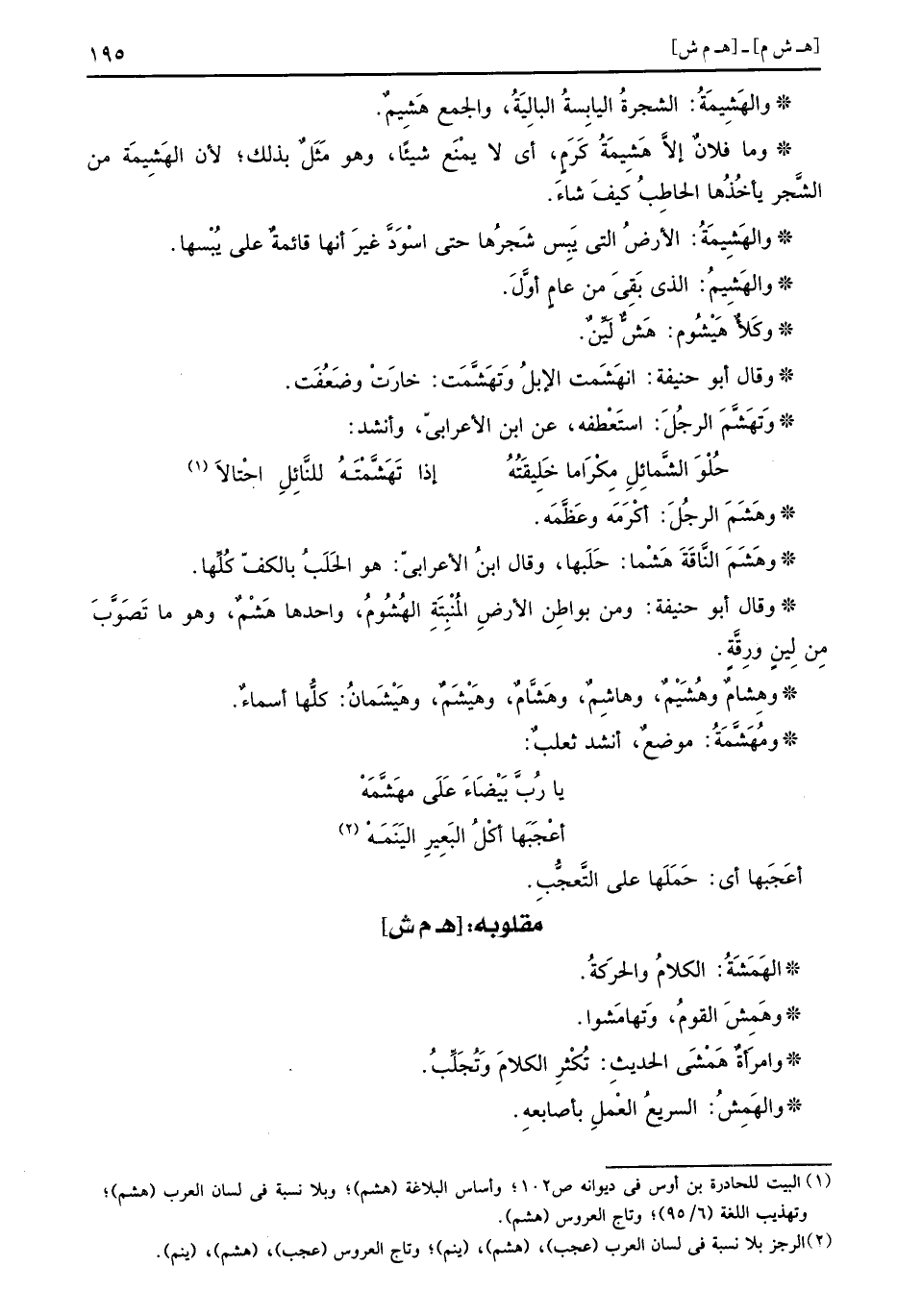 وَقَالَ أَبُو حنيفَة: وَمن بواطن الأَرْض المنبتة الهُشُومُ، وَاحِدهَا هَشْمٌ، وَهُوَ مَا تصوب من لين ورقة.