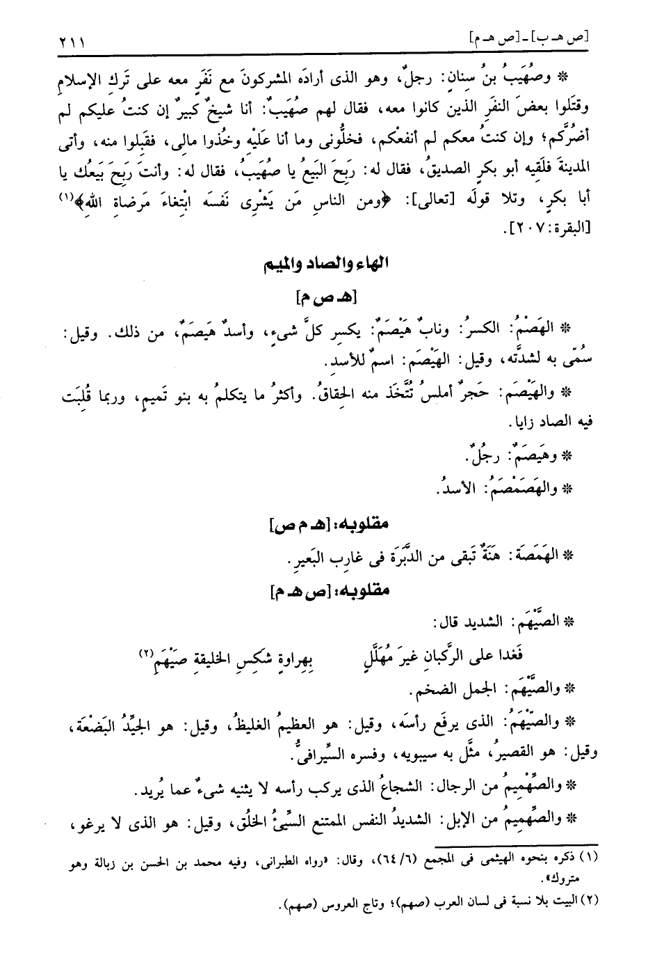 والصّيْهَمُ: الَّذِي يرفع رَأسه، وَقيل: هُوَ الْعَظِيم الغليظ، وَقيل: هُوَ الْجيد الْبضْعَة، وَقيل: هُوَ الْقصير، مثل بِهِ سِيبَوَيْهٍ، وَفَسرهُ السيرافي.
