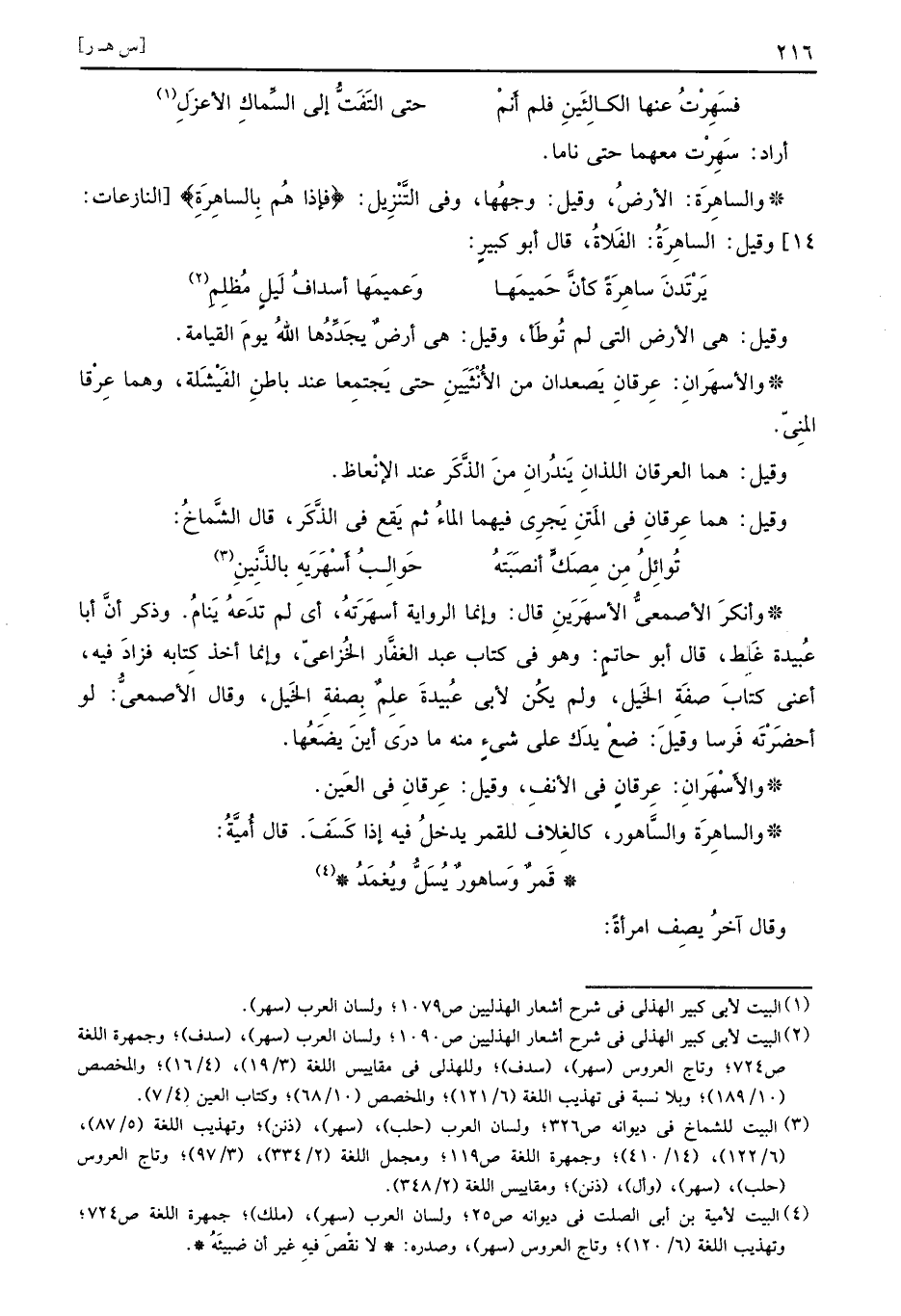 وَأنكر الْأَصْمَعِي الأسهَرَينِ قَالَ: وَإِنَّمَا الرِّوَايَة أسهَرَتهُ، أَي لم تَدعه ينَام. وَذكر أَن أَبَا عُبَيْدَة غلط، قَالَ أَبُو حَاتِم، وَهُوَ فِي كتاب عبد الْغفار الْخُزَاعِيّ، وَإِنَّمَا اخذ كِتَابه فَزَاد فِيهِ، اعني كتاب صفة الْخَيل، وَلم يكن لأبي عُبَيْدَة علم بِصفة الْخَيل، وَقَالَ الْأَصْمَعِي: لَو أحضرته فرسا وَقيل: ضع يدك على شَيْء مِنْهُ مَا درى أَيْن يَضَعهَا.