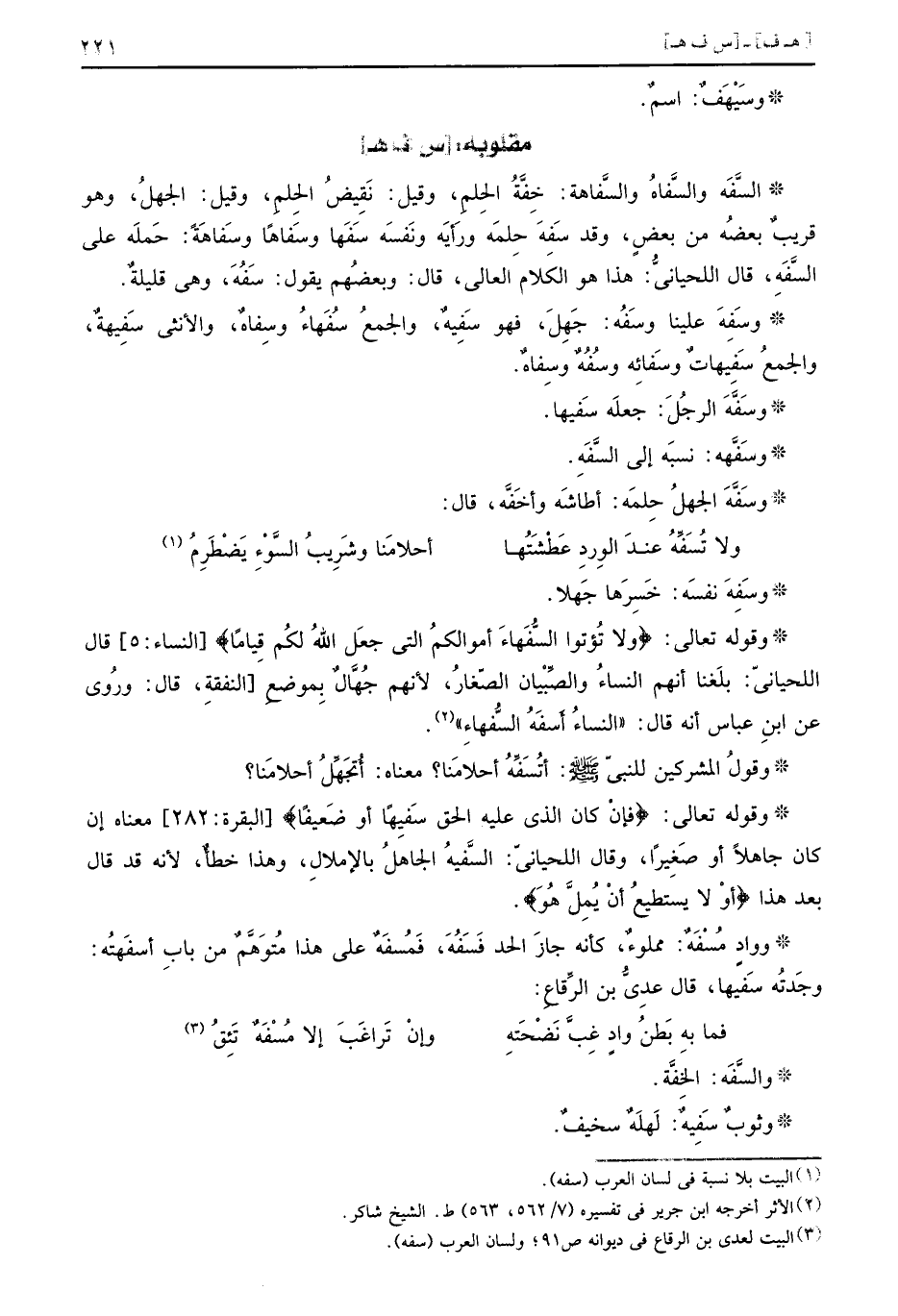 وَقَول الْمُشْركين للنَّبِي صَلَّى اللهُ عَلَيْهِ وَسَلَّمَ: أتسفه أَحْلَامنَا؟ مَعْنَاهُ: أتجهل أَحْلَامنَا؟ وَقَوله تَعَالَى: (فإنْ كَانَ الَّذِي عَلَيْهِ الْحق سَفِيها أَو ضَعيفا) مَعْنَاهُ إِن كَانَ جَاهِلا أَو صَغِيرا، وَقَالَ اللحياني: السَّفيهُ الْجَاهِل بالإملال، وَهَذَا خطأ، لِأَنَّهُ قد قَالَ بعد هَذَا (أوْ لَا يستطيعُ أَن يُمِلَّ هُوَ) .