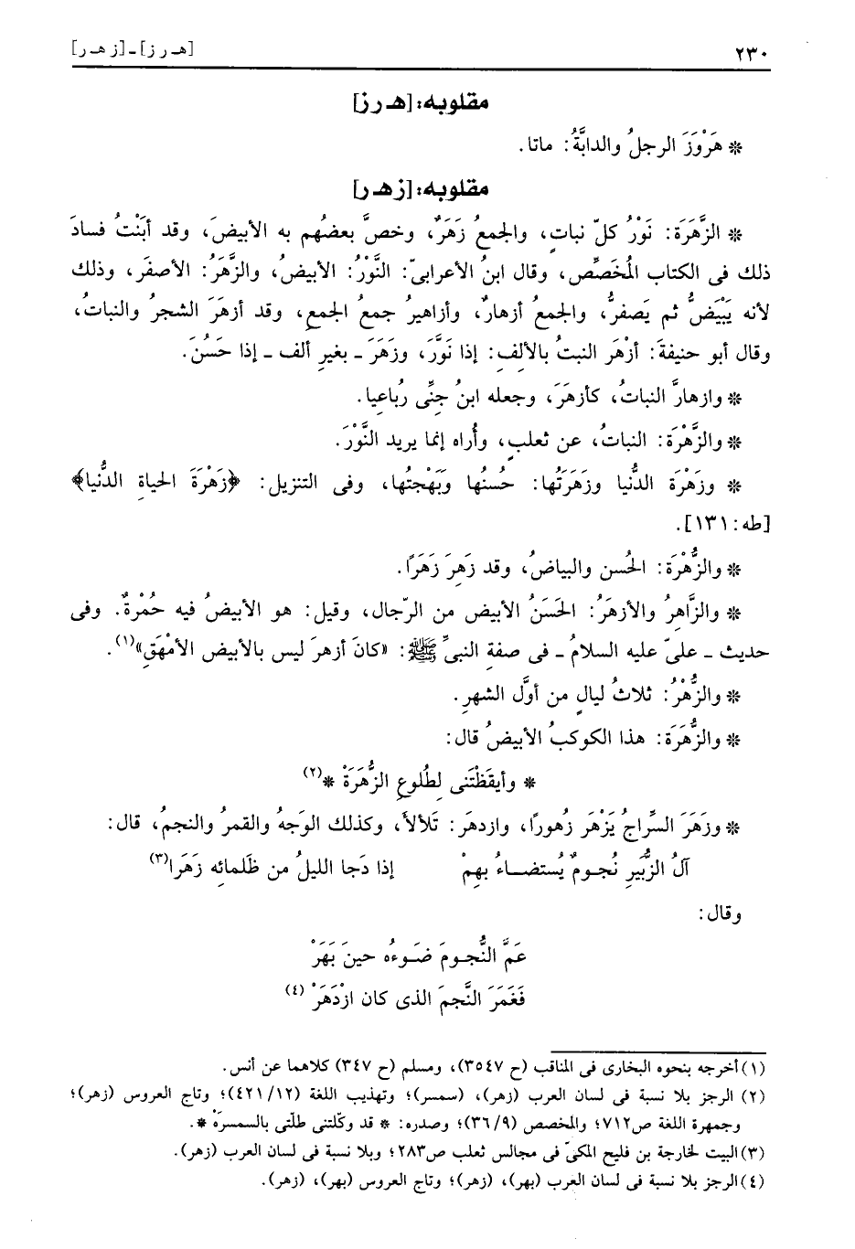 وزَهَرَ السراج يَزْهَر زُهورا، وازدهَر: تلألأ، وَكَذَلِكَ الْوَجْه وَالْقَمَر والنجم، قَالَ:
