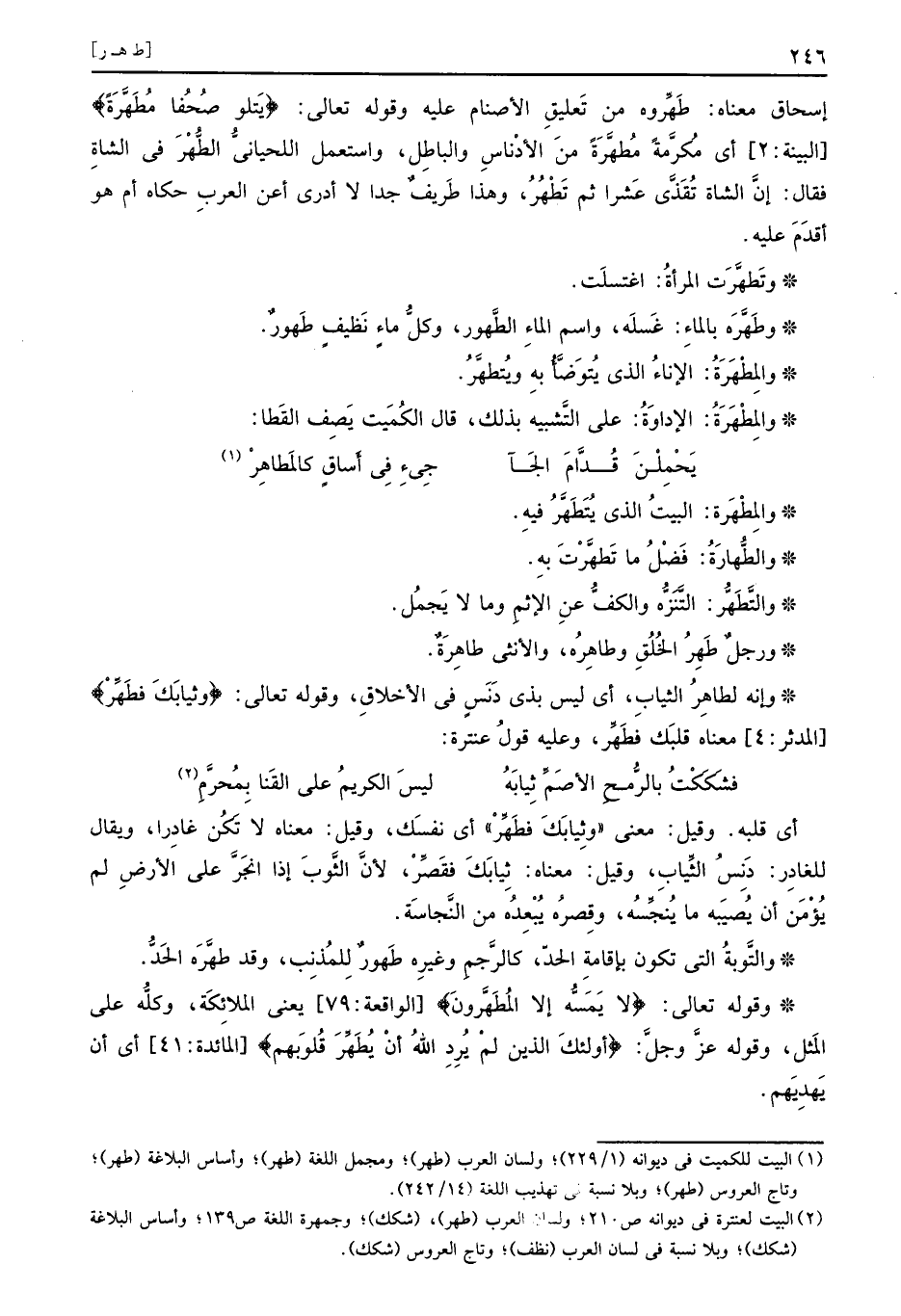 إِسْحَاق مَعْنَاهُ: طهروه من تَعْلِيق الْأَصْنَام عَلَيْهِ وَقَوله تَعَالَى: (يَتلو صُحُفا مُطَهَّرَةً) أَي مكرمَة مطهَّرة من الأدناس وَالْبَاطِل، وَاسْتعْمل اللحياني الطُّهر فِي الشَّاة فَقَالَ: إِن الشَّاة تقذى عشرا ثمَّ تطهر، وَهَذَا طريف جدا لَا أَدْرِي أعن الْعَرَب حَكَاهُ أم هُوَ أقدم عَلَيْهِ.