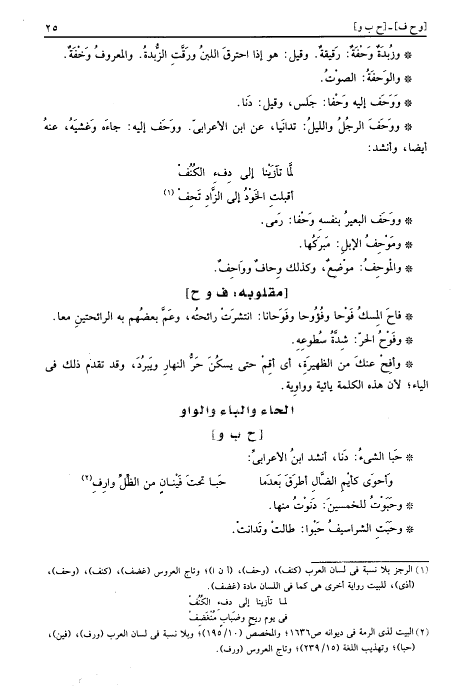 ووَحَفَ الرجل وَاللَّيْل: تدانيا، عَن ابْن الْأَعرَابِي. ووَحَف إِلَيْهِ: جَاءَهُ وغشيه، عَنهُ أَيْضا، وَأنْشد: